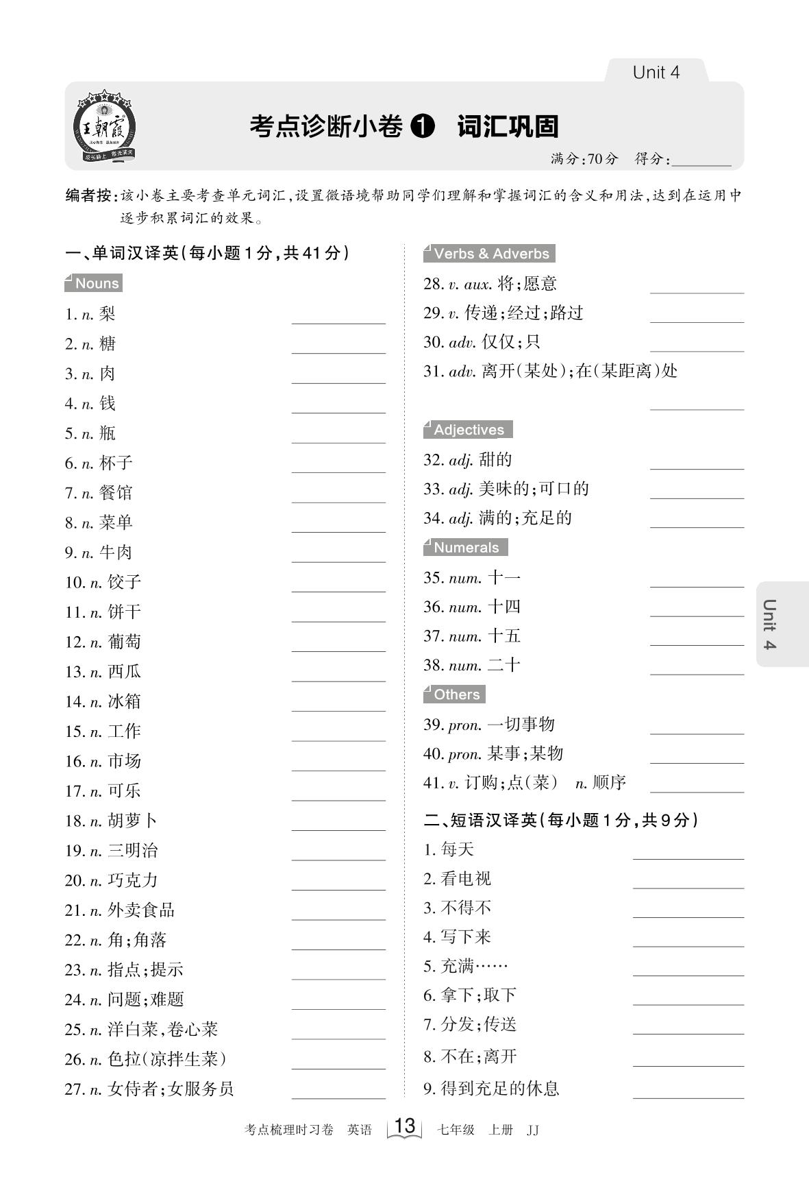 2023上册七年级英语冀教版 Unit 4 考点诊断小卷1 词汇巩固