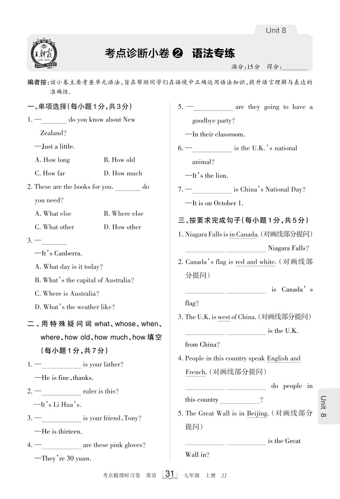 2023上册七年级英语冀教版 Unit 8 考点诊断小卷2 语法专练