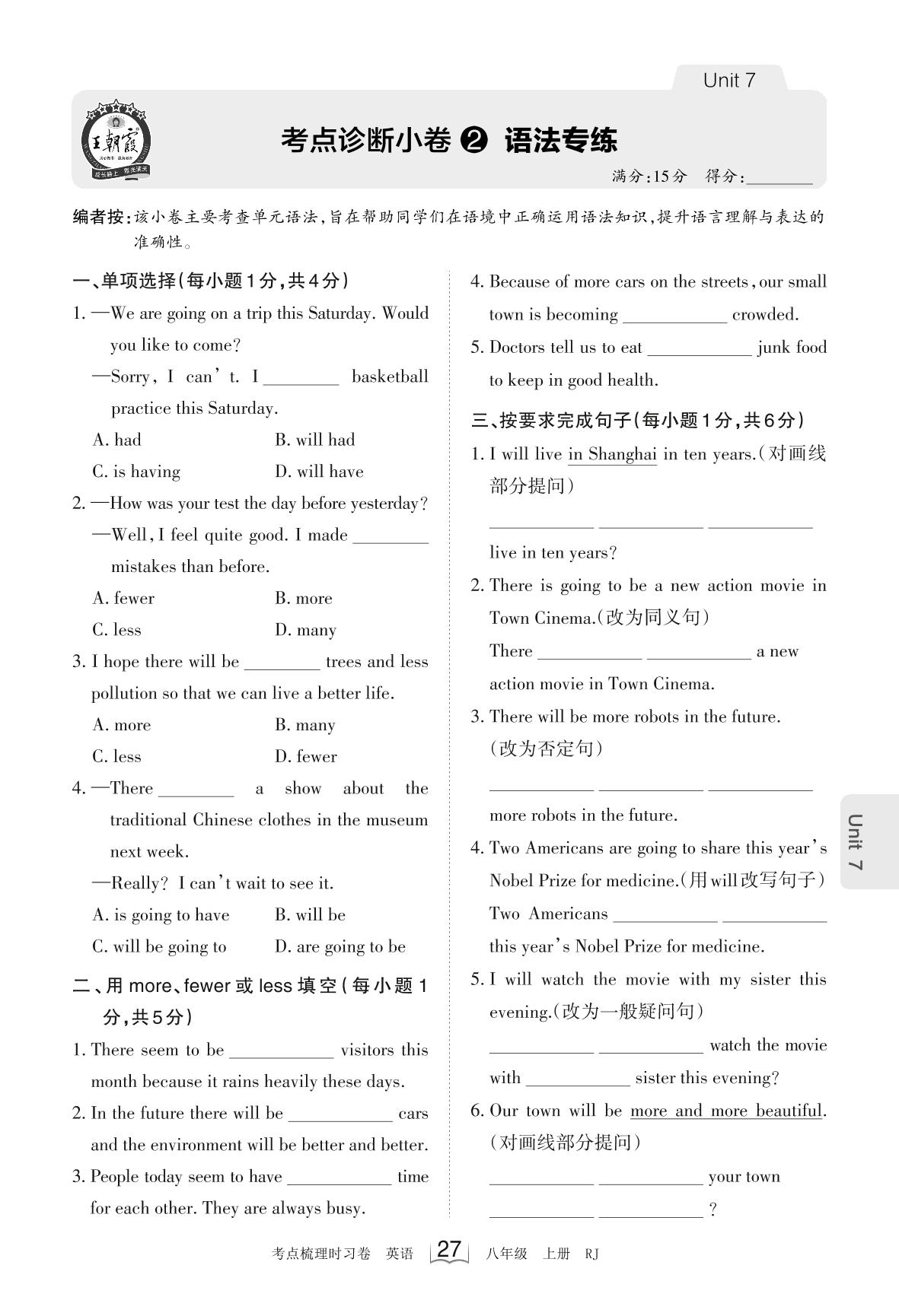 2023上册八年级英语人教版 Unit 7 考点诊断小卷2 语法专练_R230828152832650