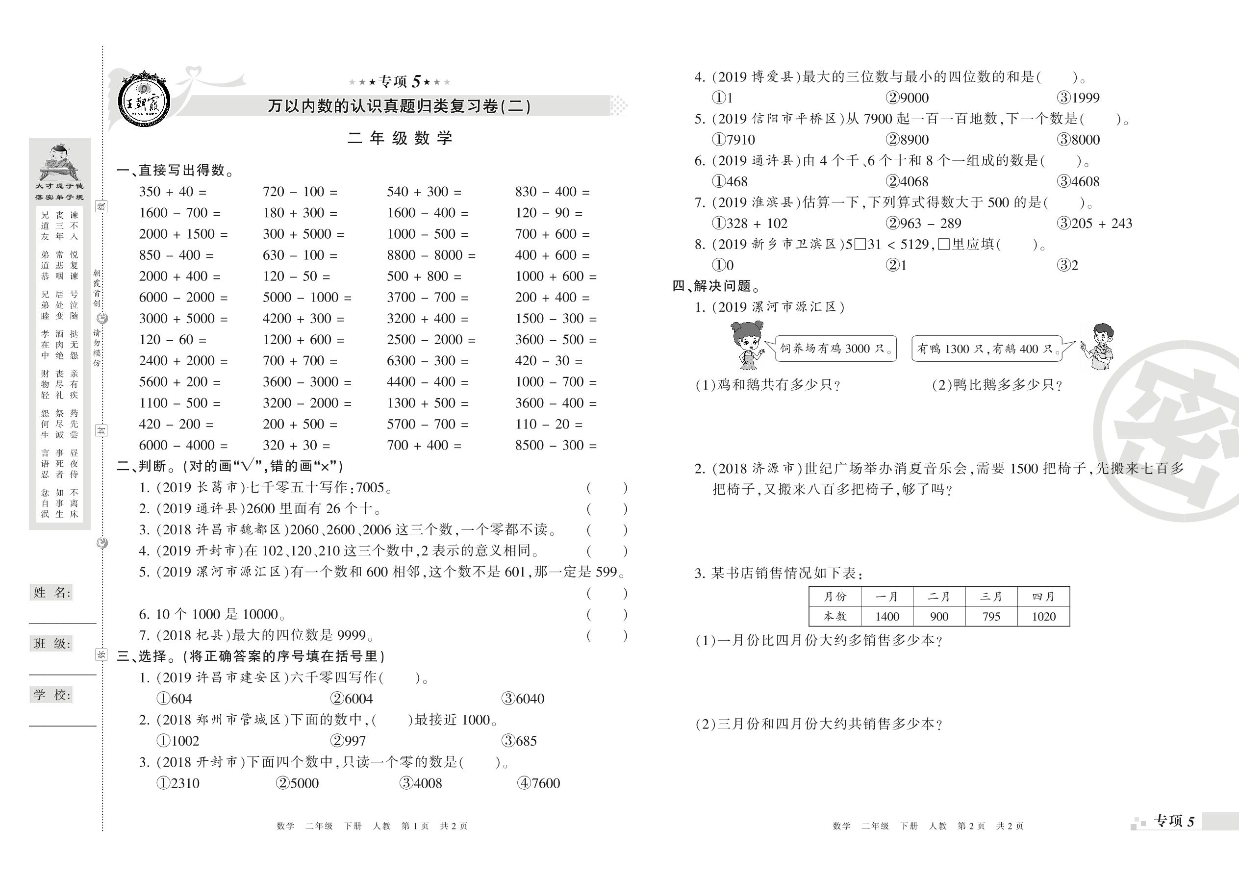 王朝霞期末专项卷——万以内数的认识(二)、数据收集整理及图形的运动真题归类复习卷二年级下册数学(人教版)_R21080392044【0】