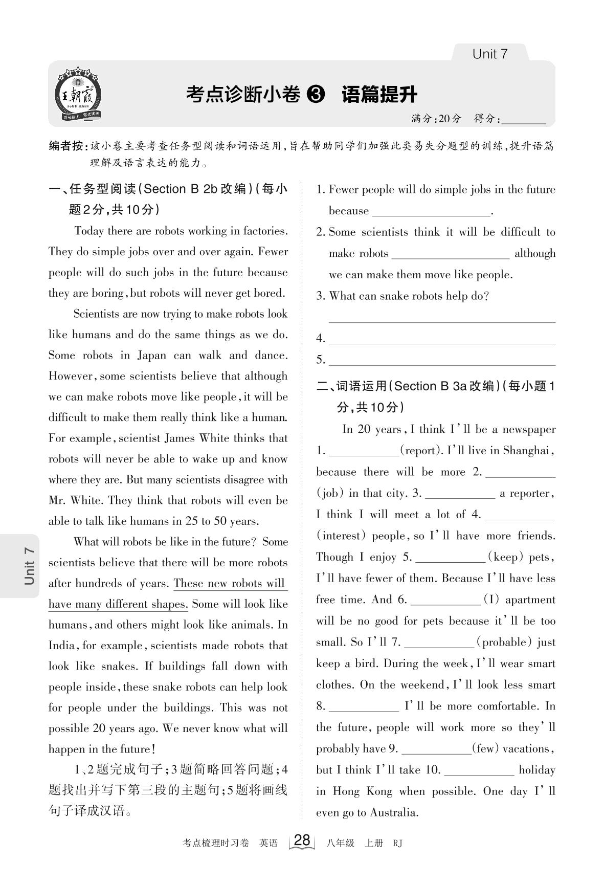 2023上册八年级英语人教版 Unit 7 考点诊断小卷3 语篇提升_R230828152832325