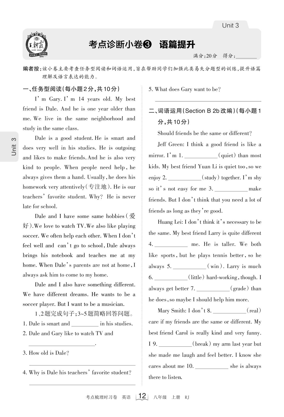 2023上册八年级英语人教版 Unit 3 考点诊断小卷3 语篇提升_R230828152833293