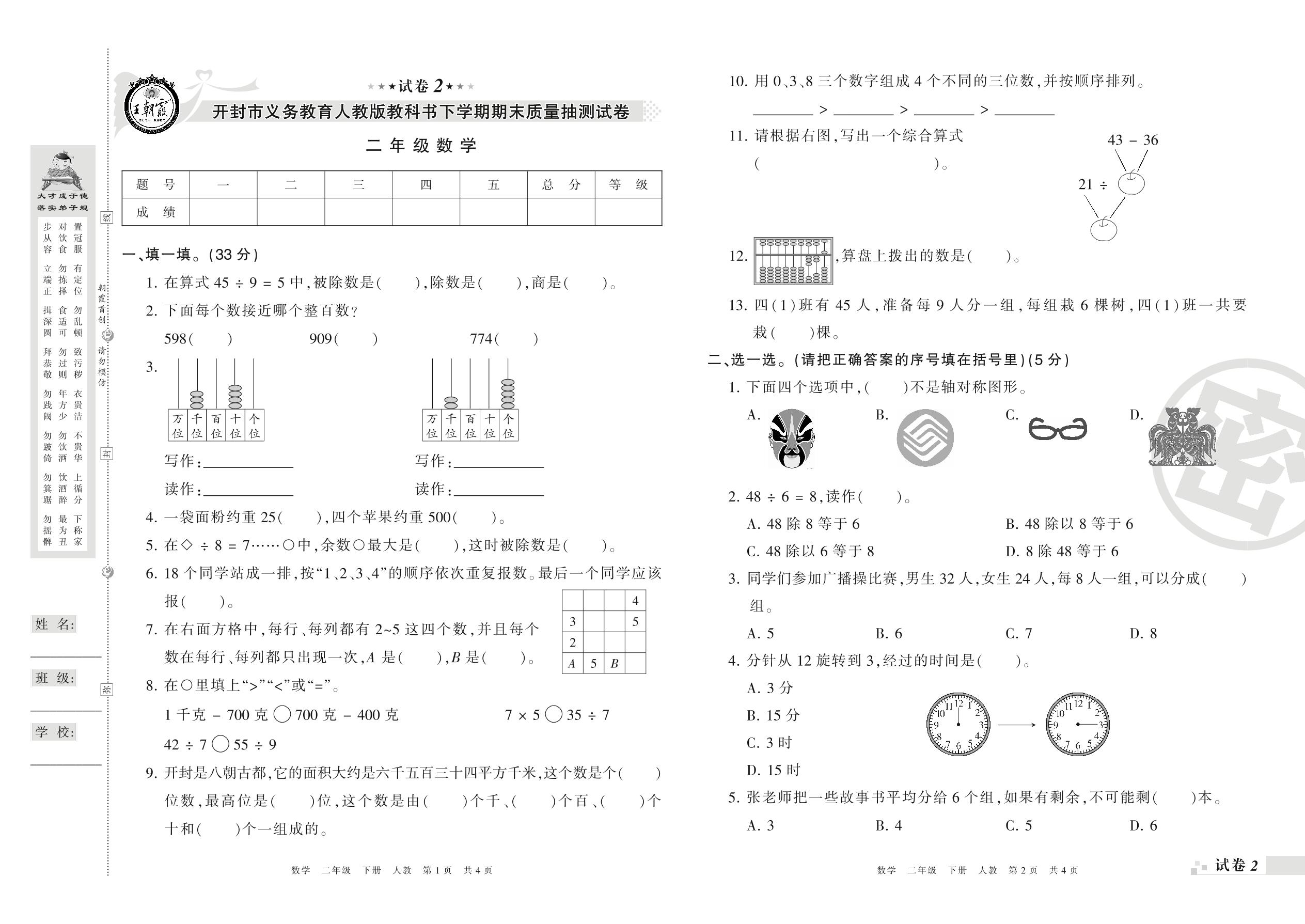 2018-2019学年第二学期开封市二年级数学试卷(人教版)【2】