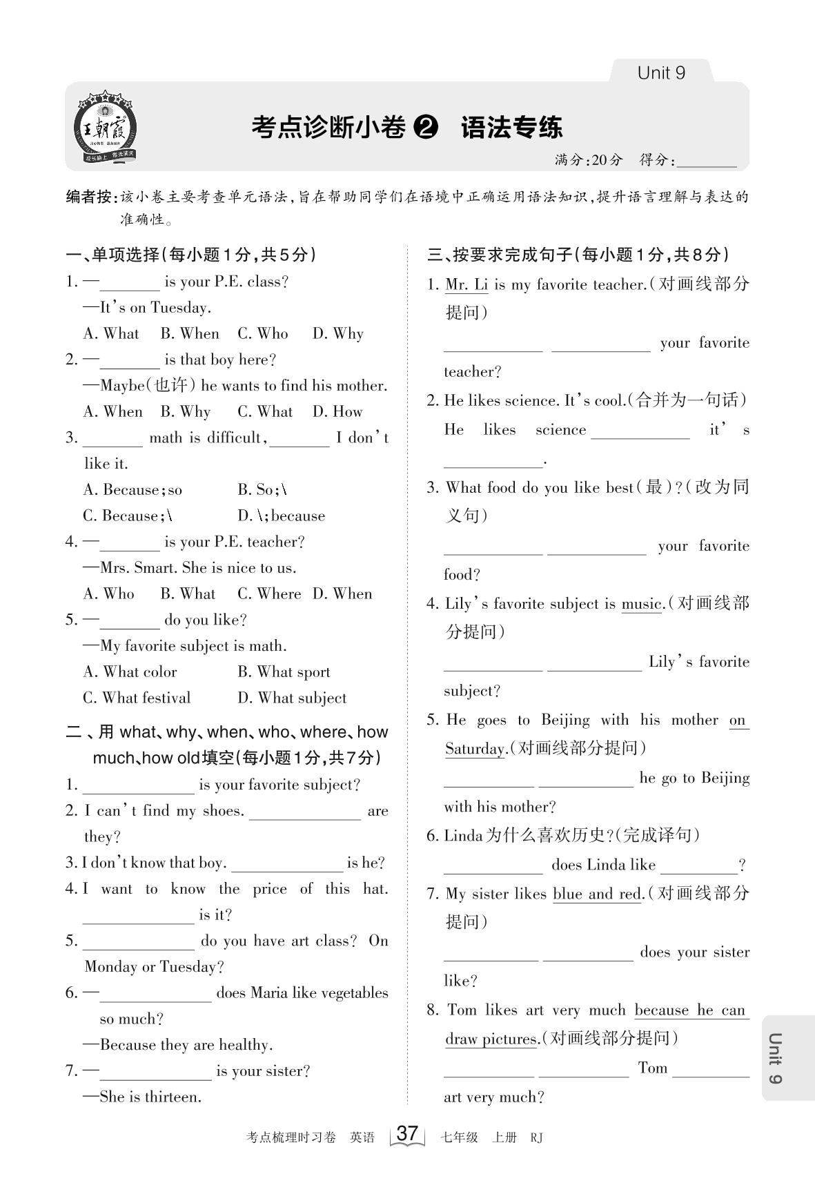 2023上册七年级英语人教版 Unit 9 考点诊断小卷2 语法专练_R230828160535199