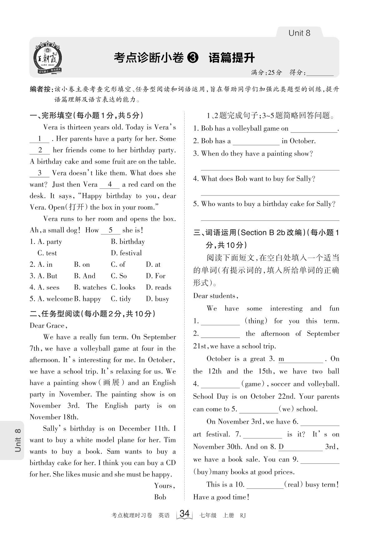 2023上册七年级英语人教版 Unit 8 考点诊断小卷3 语篇提升_R230828160536900