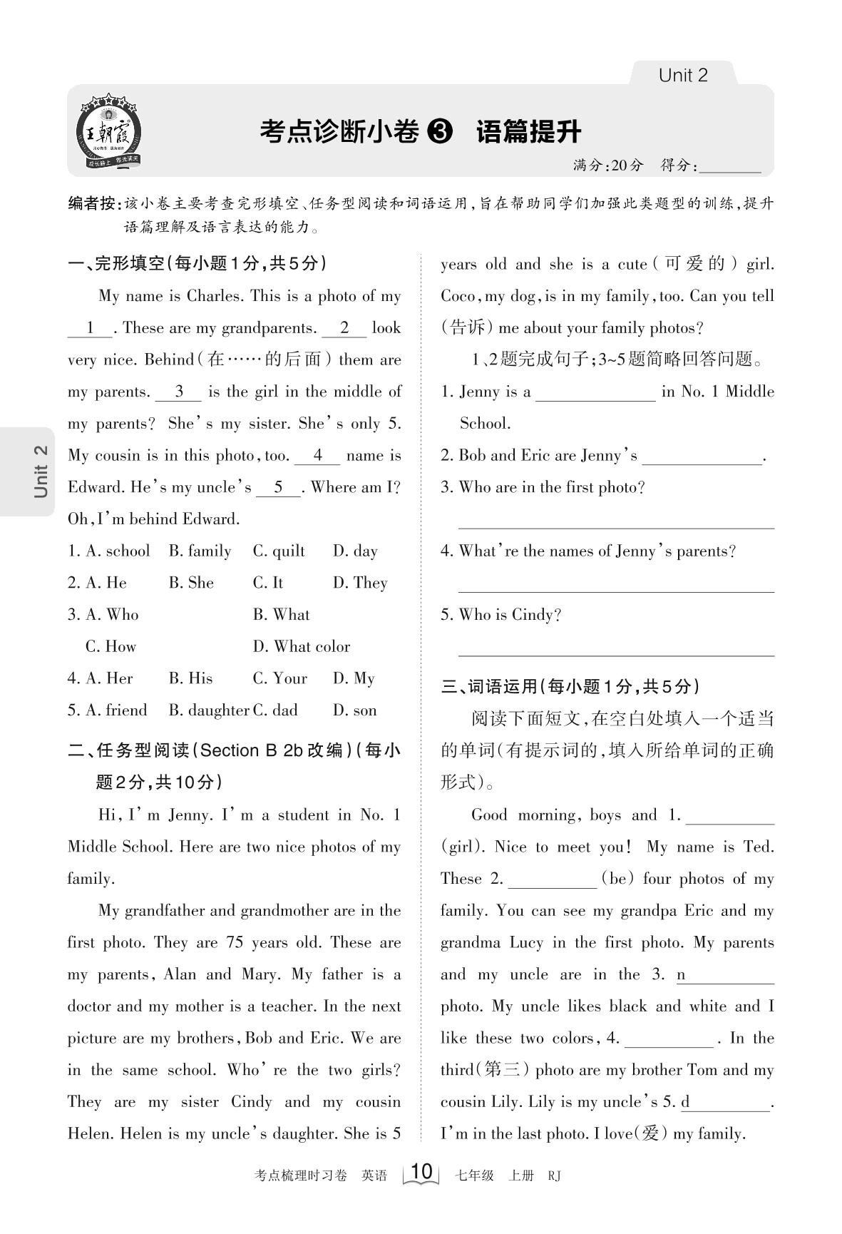 2023上册七年级英语人教版 Unit 2 考点诊断小卷3 语篇提升_R230828160538075