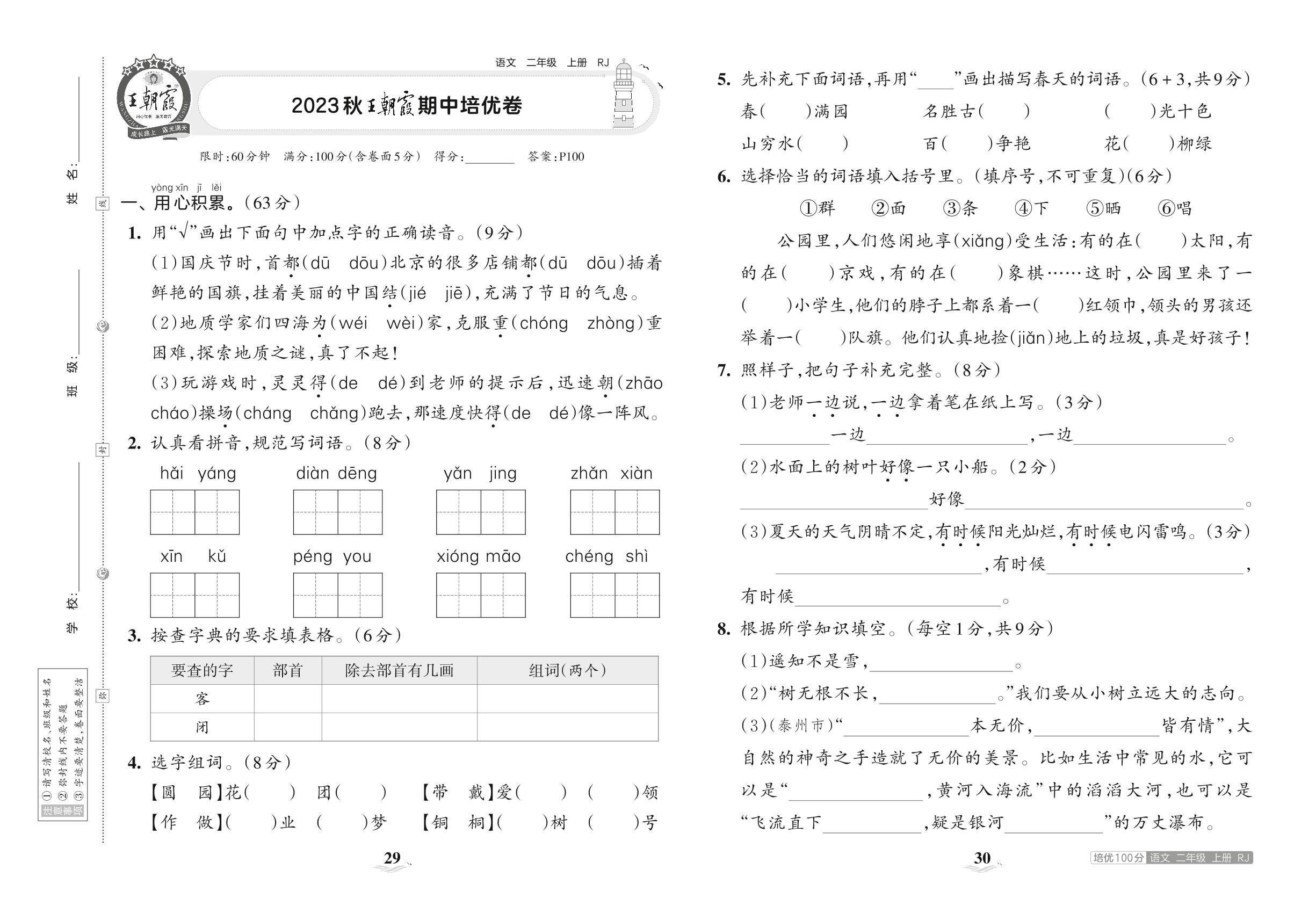 2023上册二年级语文人教版 2023秋王朝霞期中培优卷