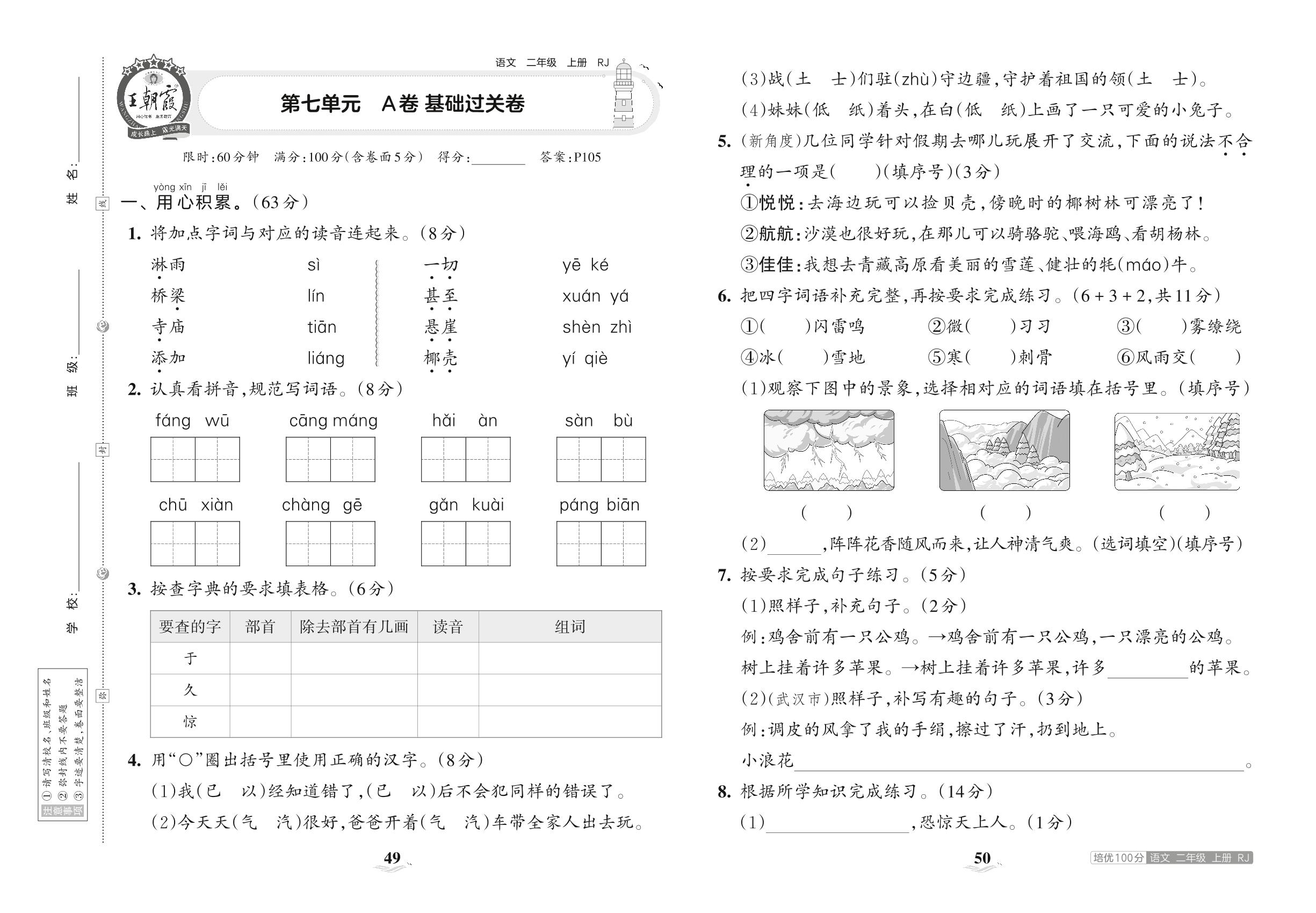 2023上册二年级语文人教版 第七单元 A卷 基础过关卷