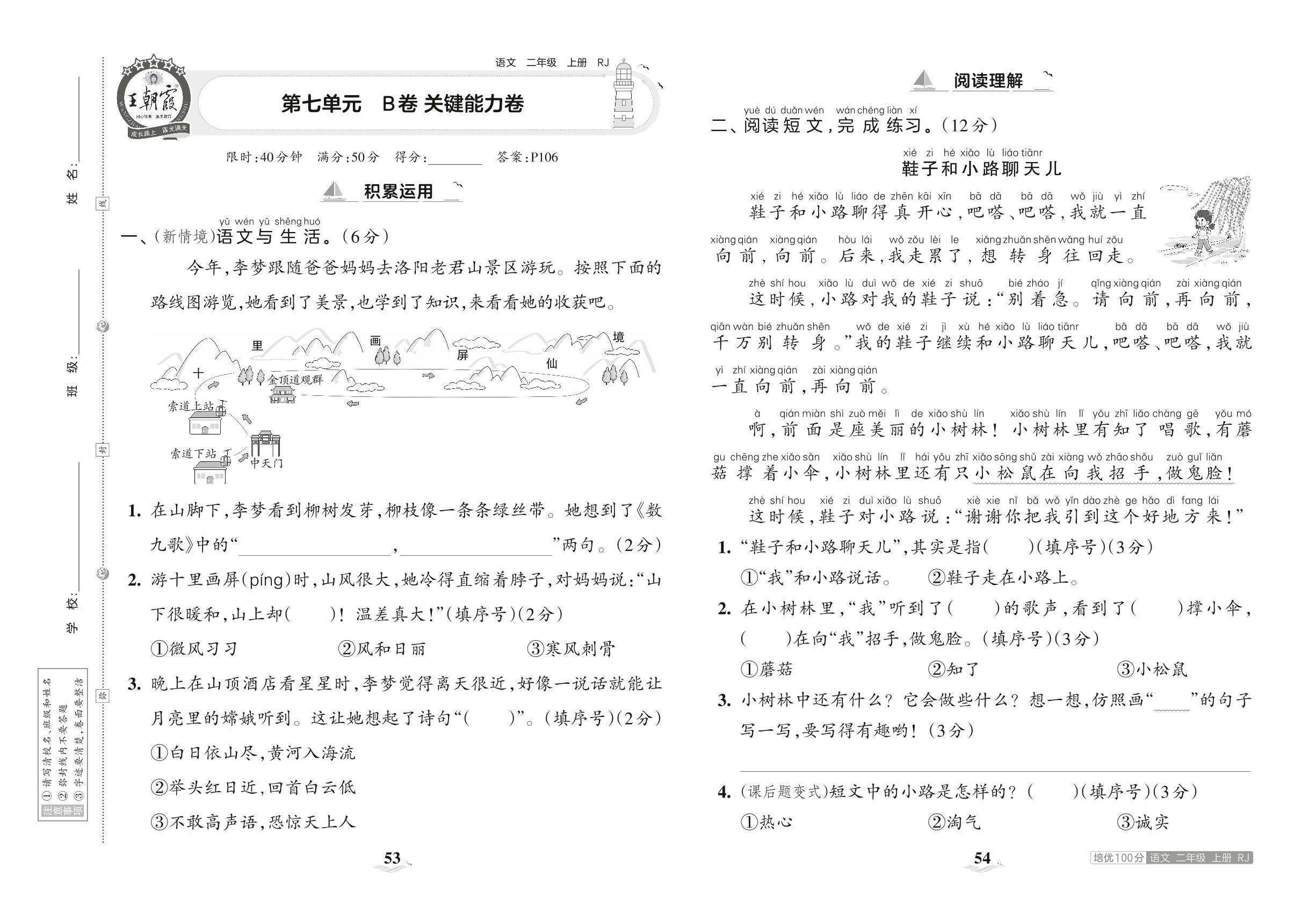2023上册二年级语文人教版 第七单元 B卷 关键能力卷