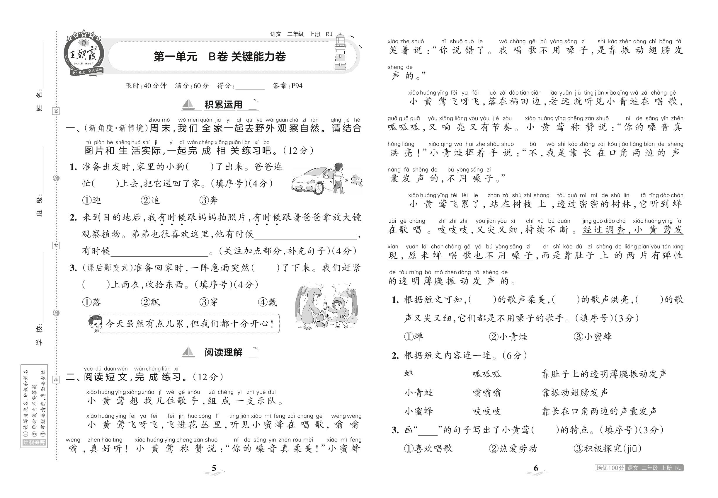 2023上册二年级语文人教版 第一单元 B卷 关键能力卷
