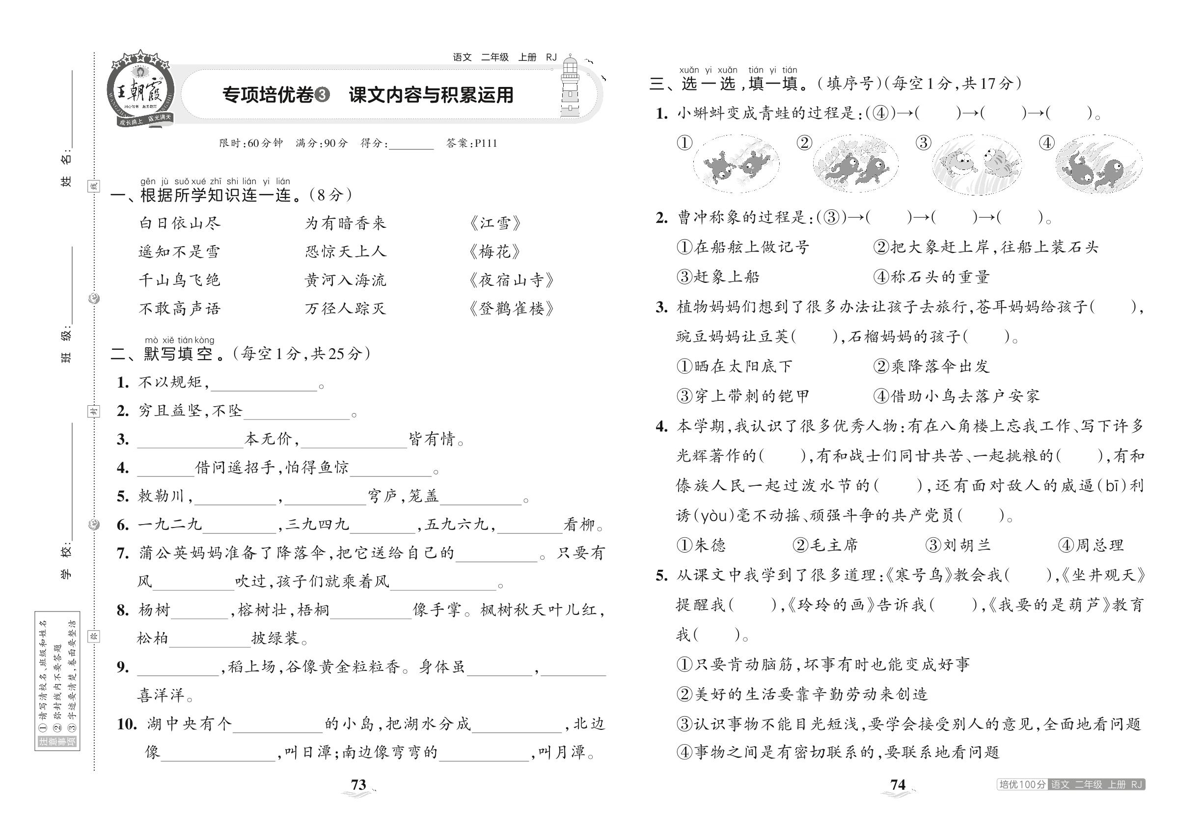 2023上册二年级语文人教版 专项培优卷3 课文内容与积累运用