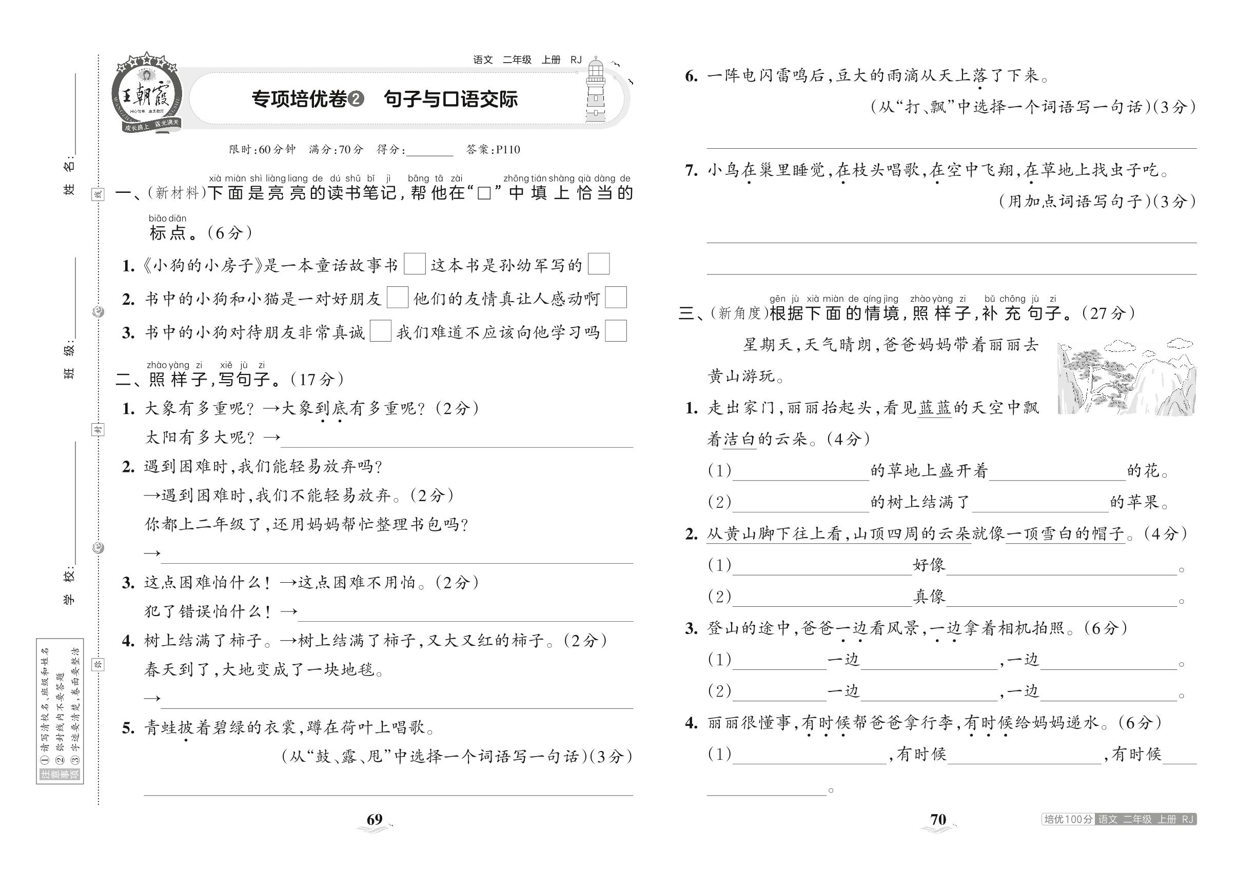 2023上册二年级语文人教版 专项培优卷2 句子与口语交际