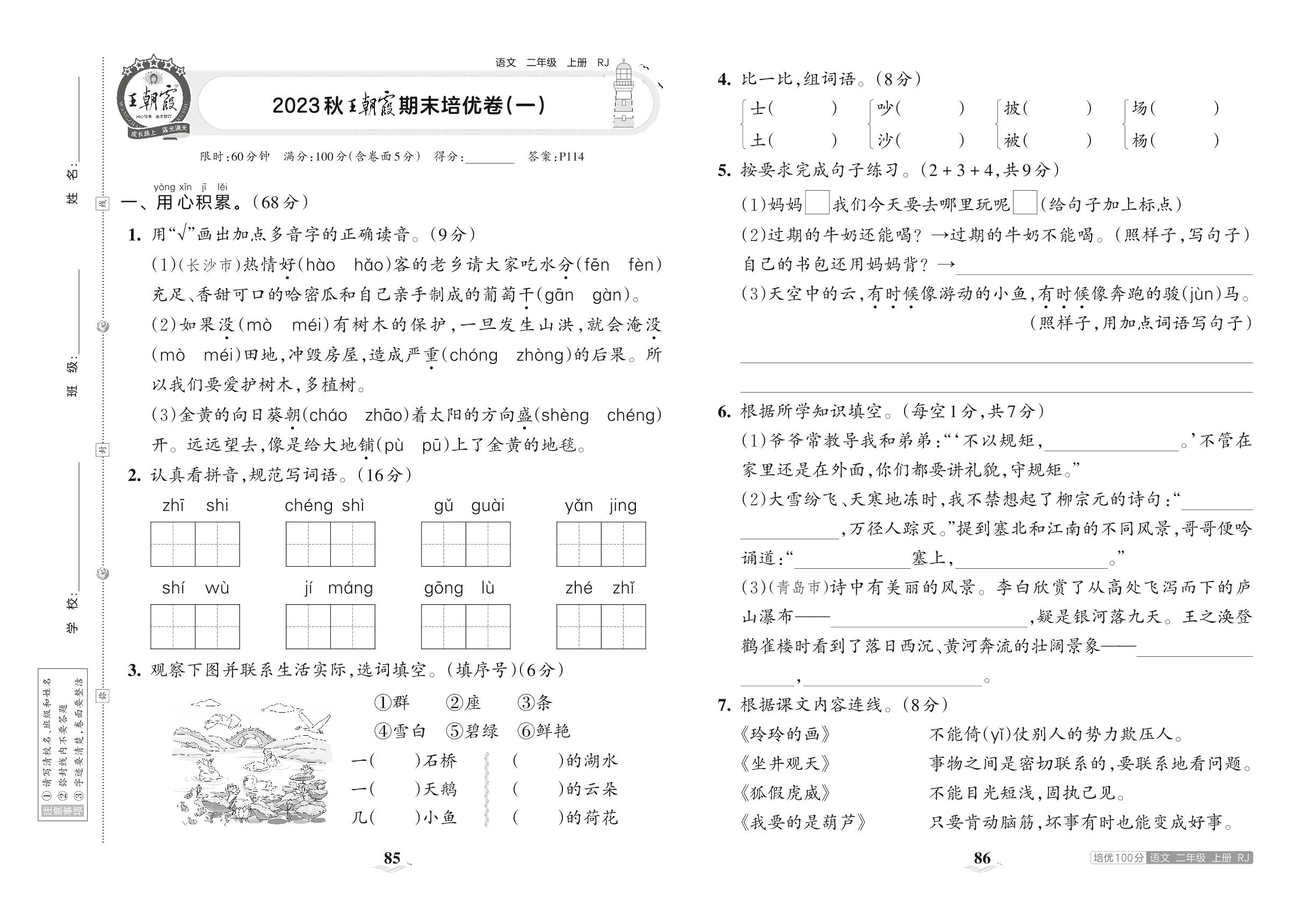 2023上册二年级语文人教版 2023秋王朝霞期末培优卷(一)