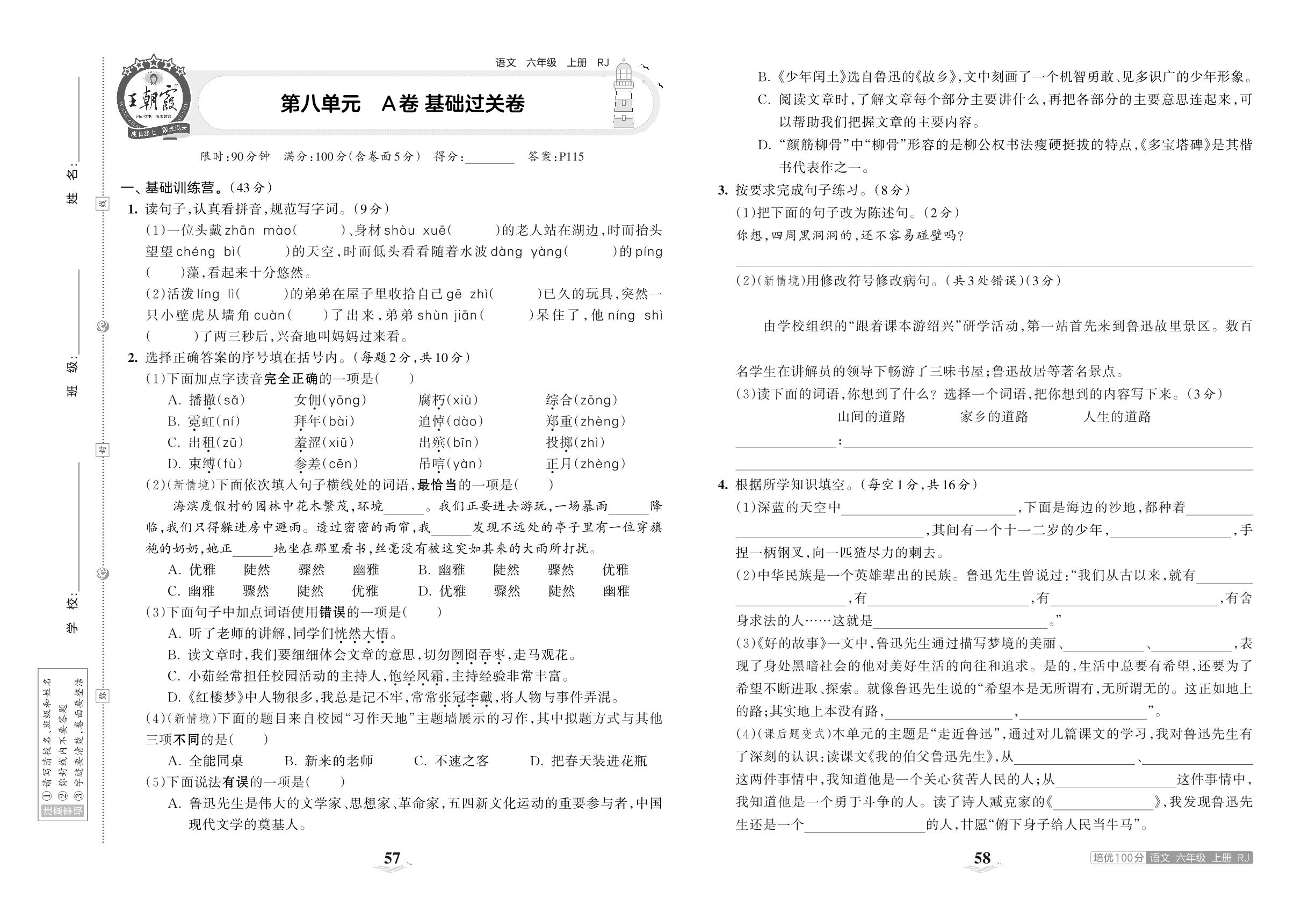 2023上册六年级语文人教版 第八单元 A卷 基础过关卷