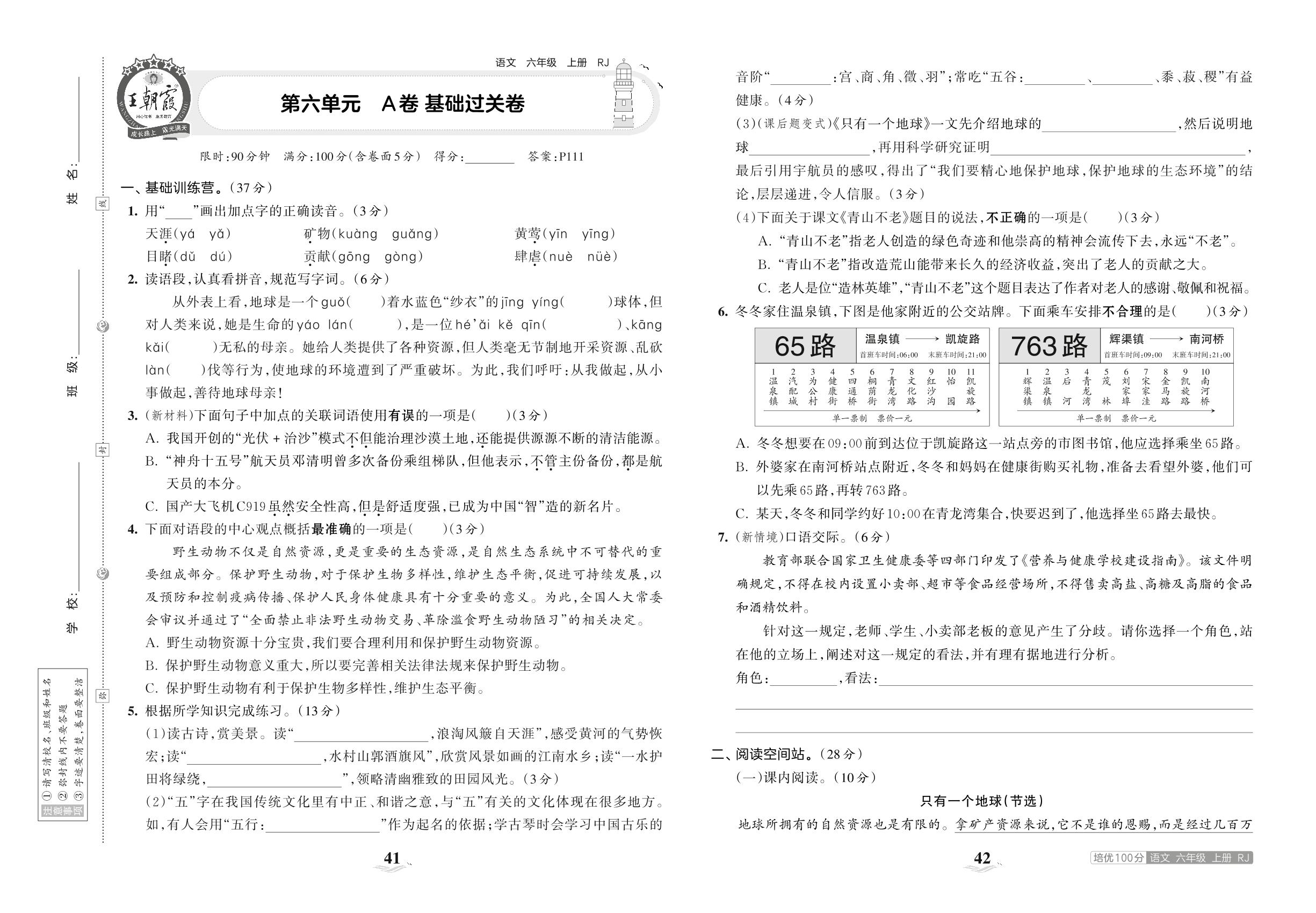 2023上册六年级语文人教版 第六单元 A卷 基础过关卷