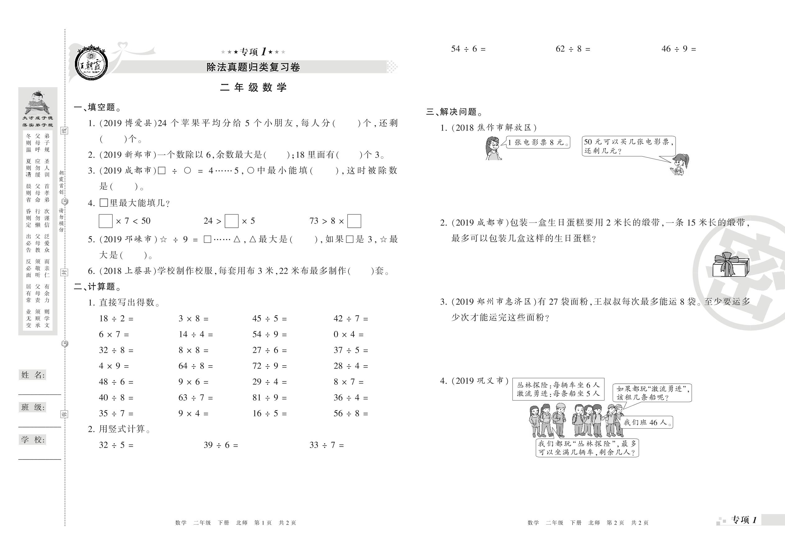 王朝霞期末专项卷——除法、生活中的大数真题归类复习卷二年级下册数学(北师版)_R21080392141【0】