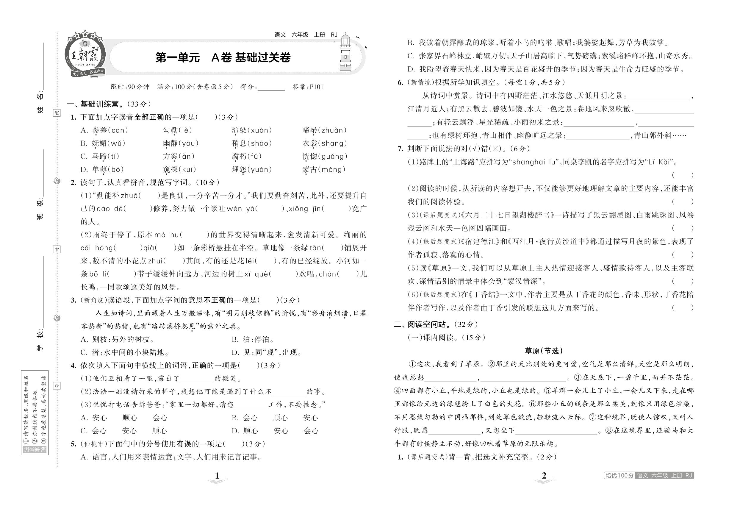 2023上册六年级语文人教版 第一单元 A卷 基础过关卷