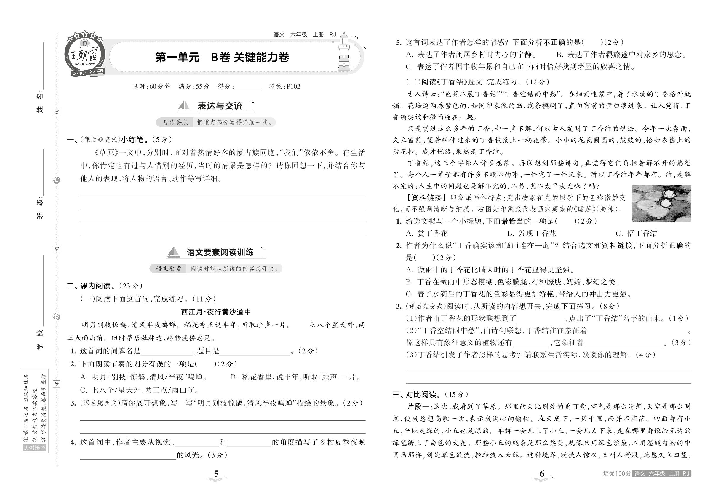 2023上册六年级语文人教版 第一单元 B卷 关键能力卷