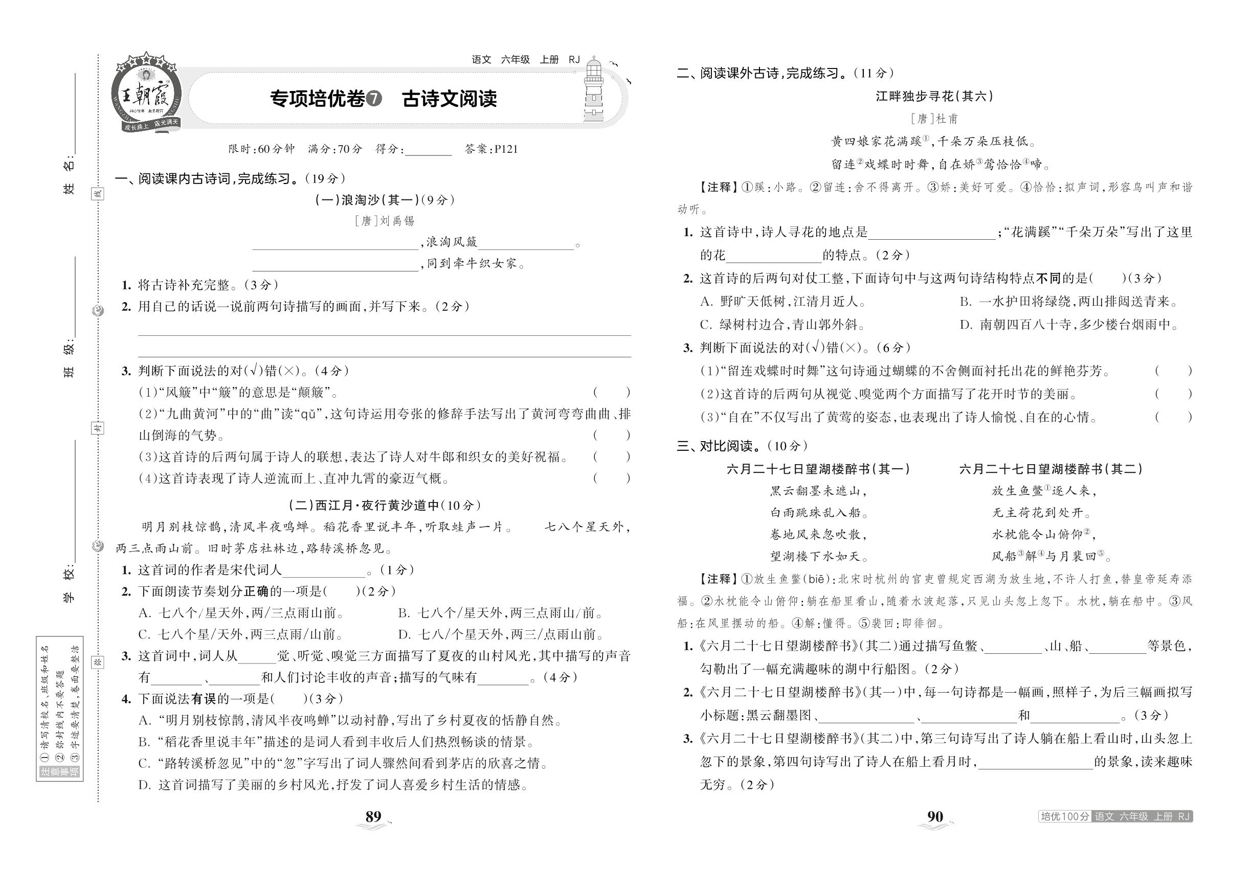 2023上册六年级语文人教版 专项培优卷7 古诗文阅读