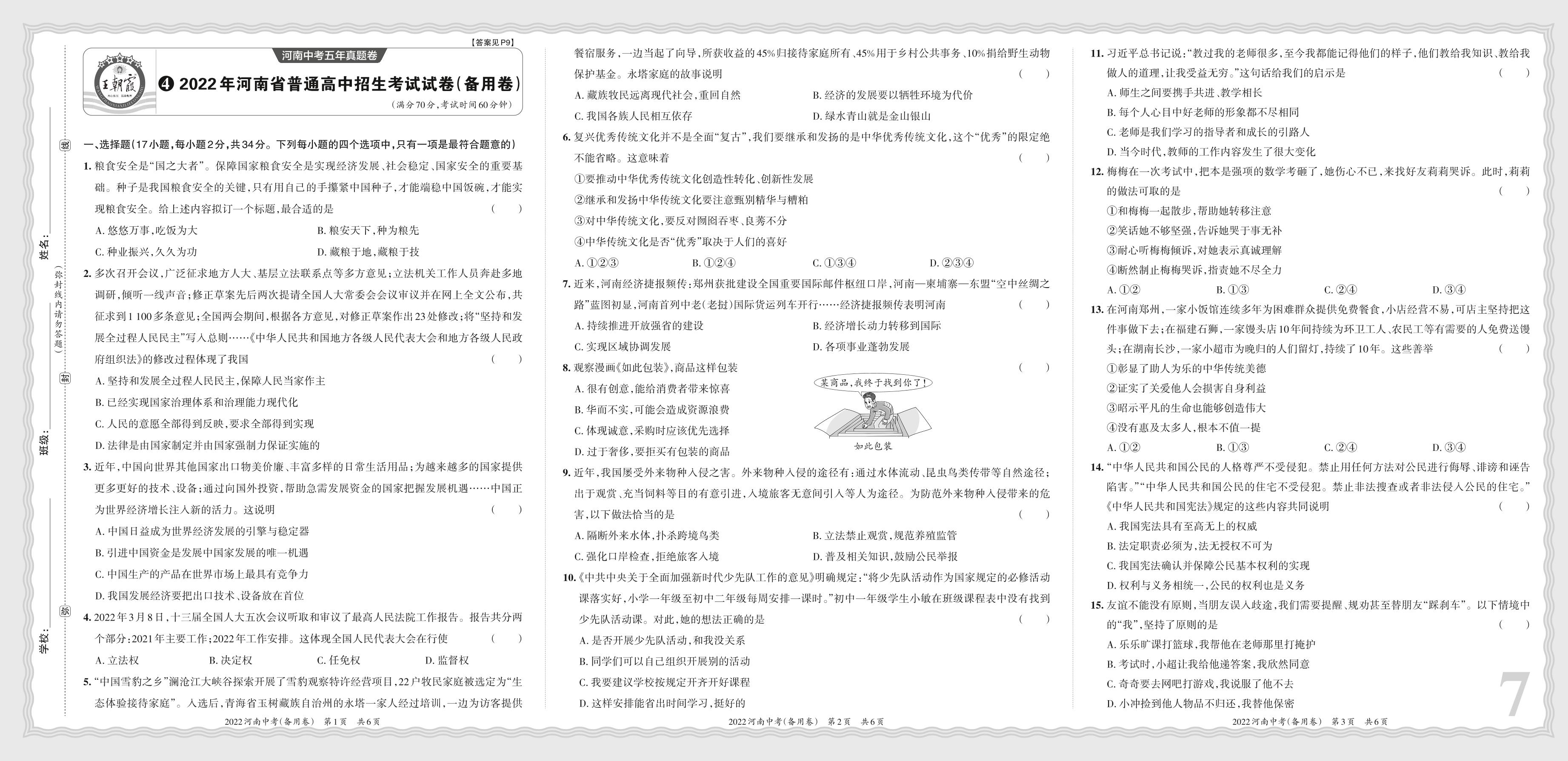 2022年河南省普通高中招生考试试卷(备用卷)·道德与法治【4】