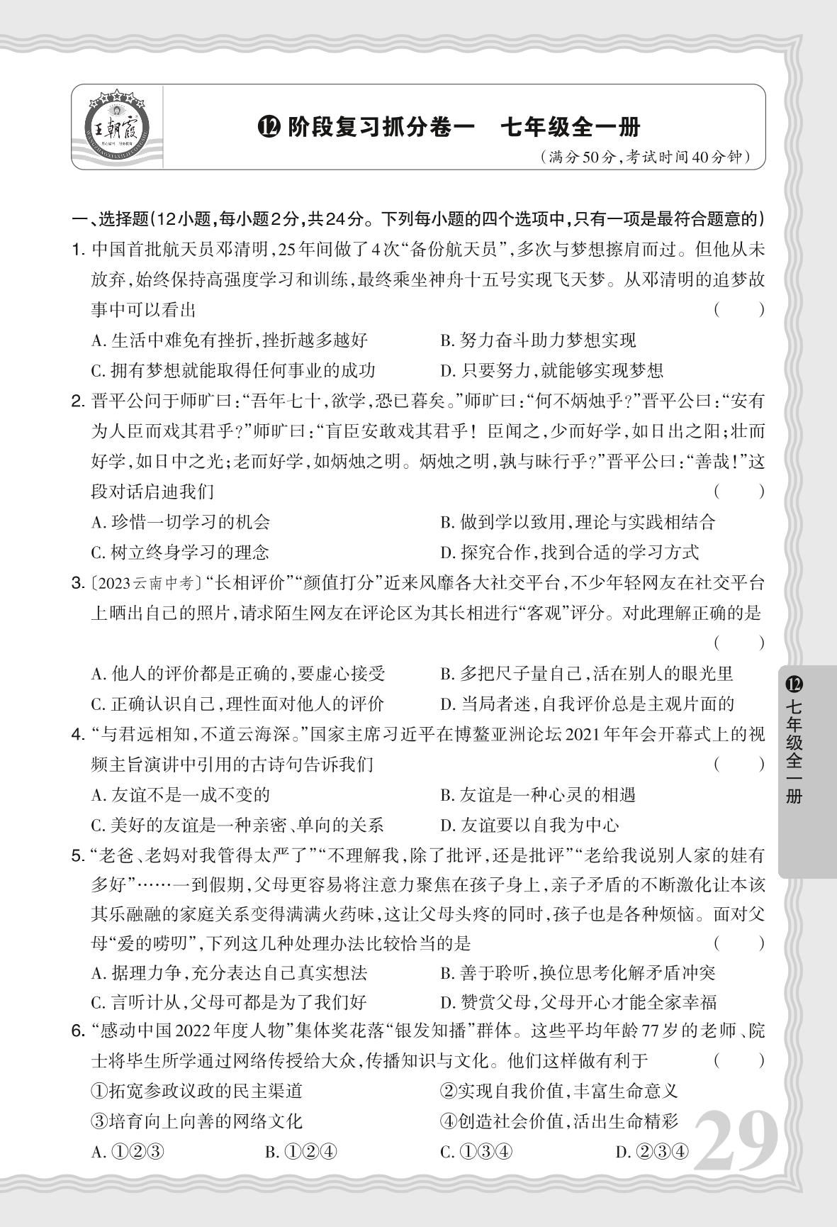 河南中考阶段复习抓分卷一 七年级全一册·道德与法治【12】