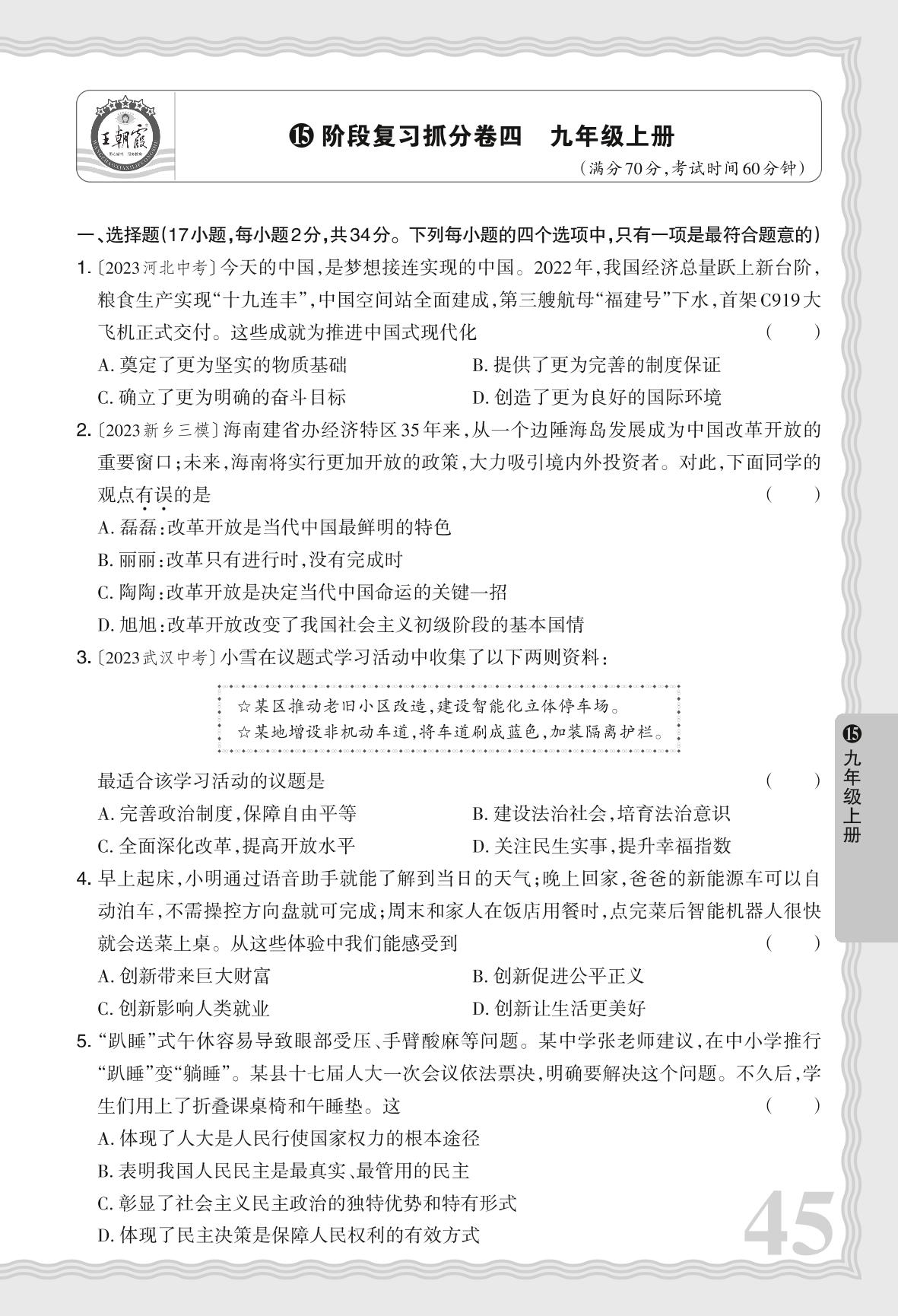 河南中考阶段复习抓分卷四 九年级上册·道德与法治【15】