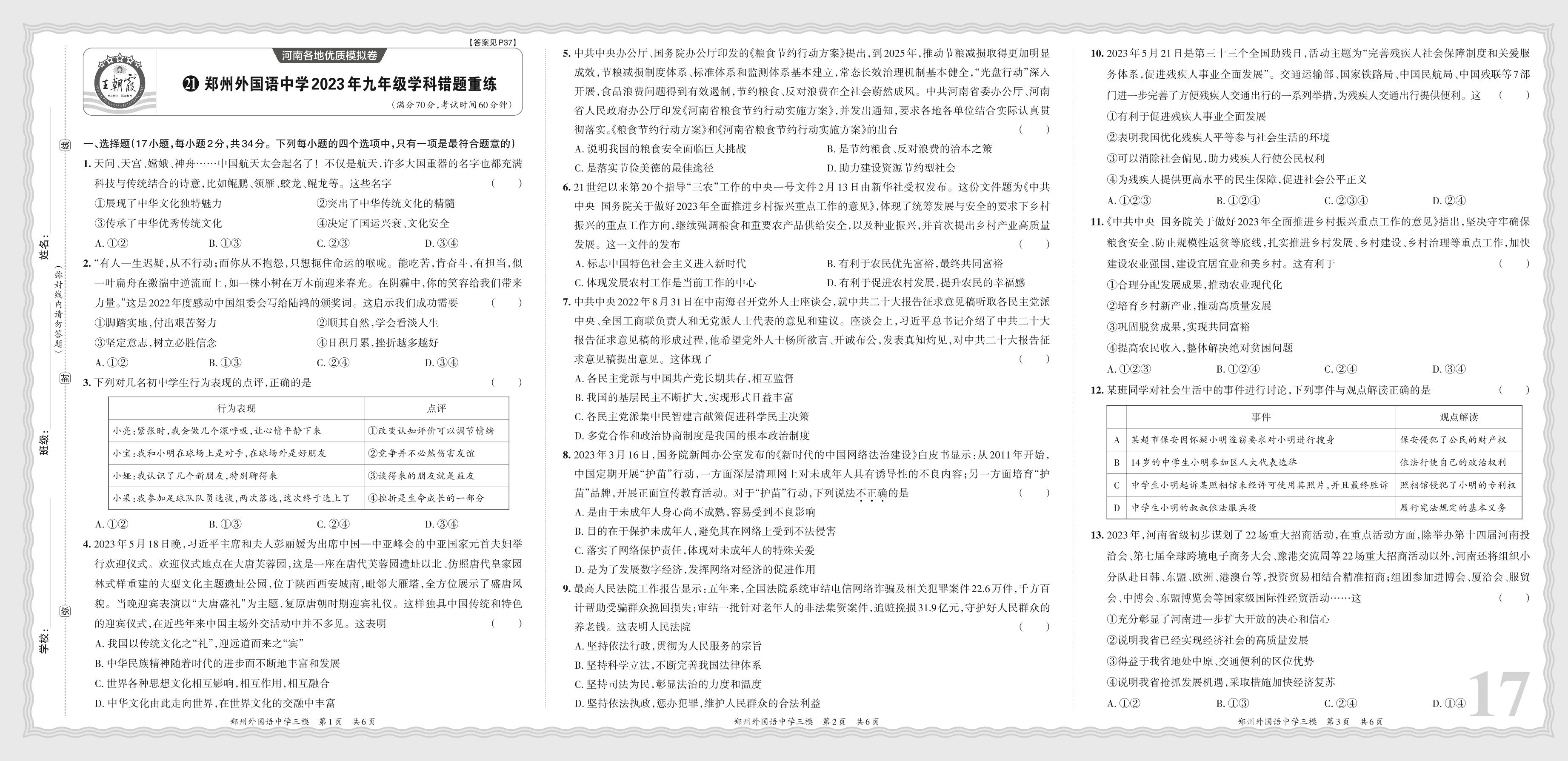 郑州外国语中学2023年九年级学科错题重练·道德与法治【21】