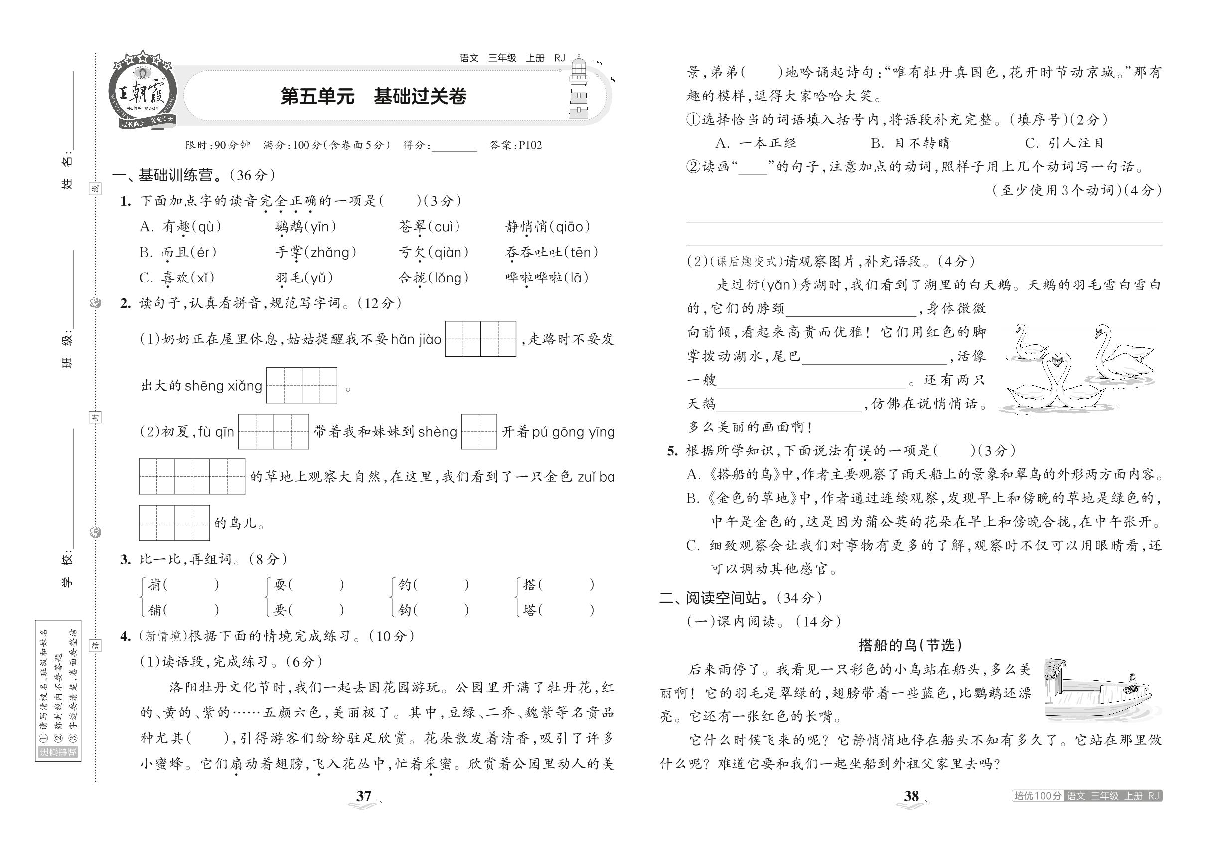 2023上册三年级语文人教版 第五单元 基础过关卷
