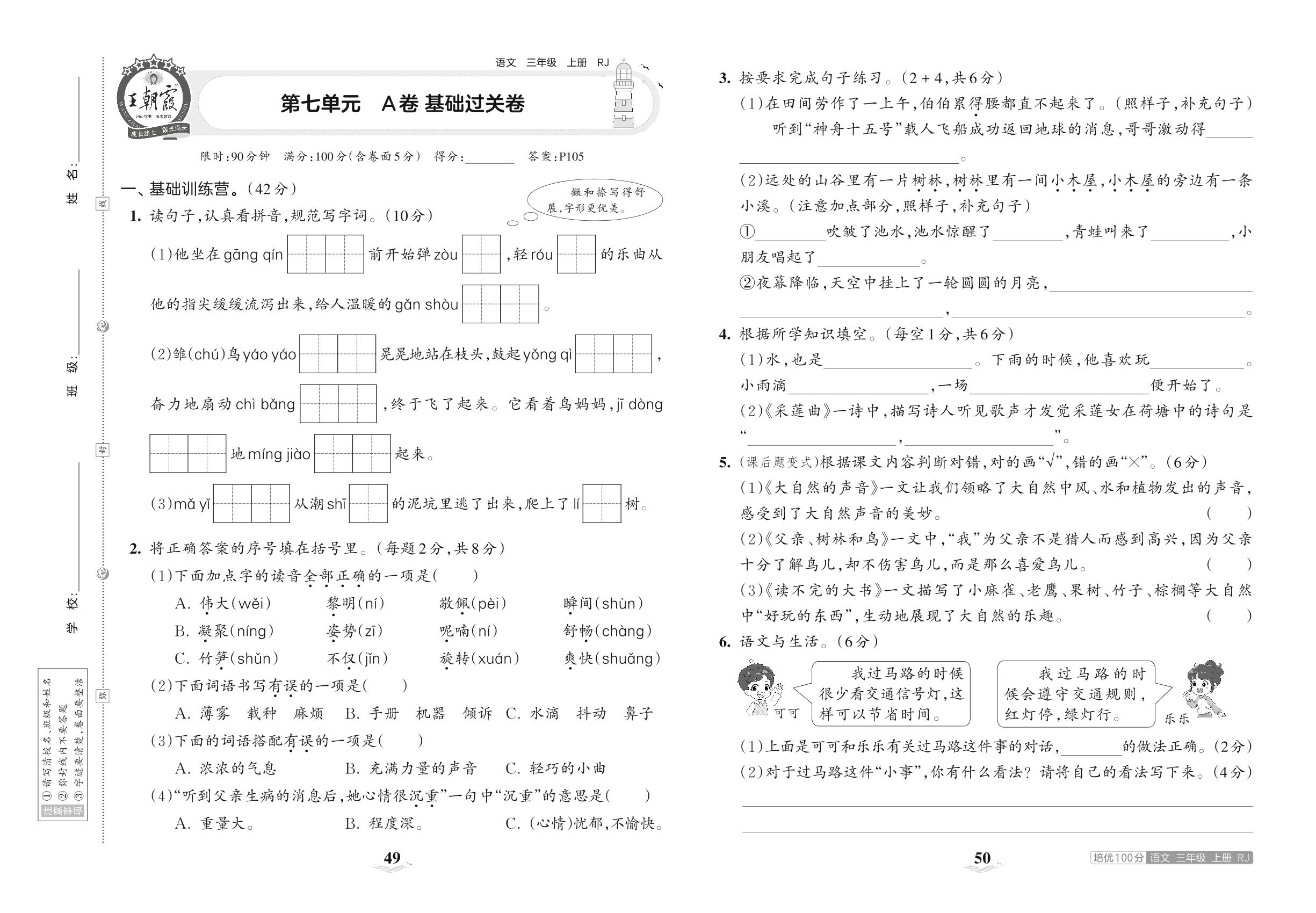 2023上册三年级语文人教版 第七单元 A卷 基础过关卷