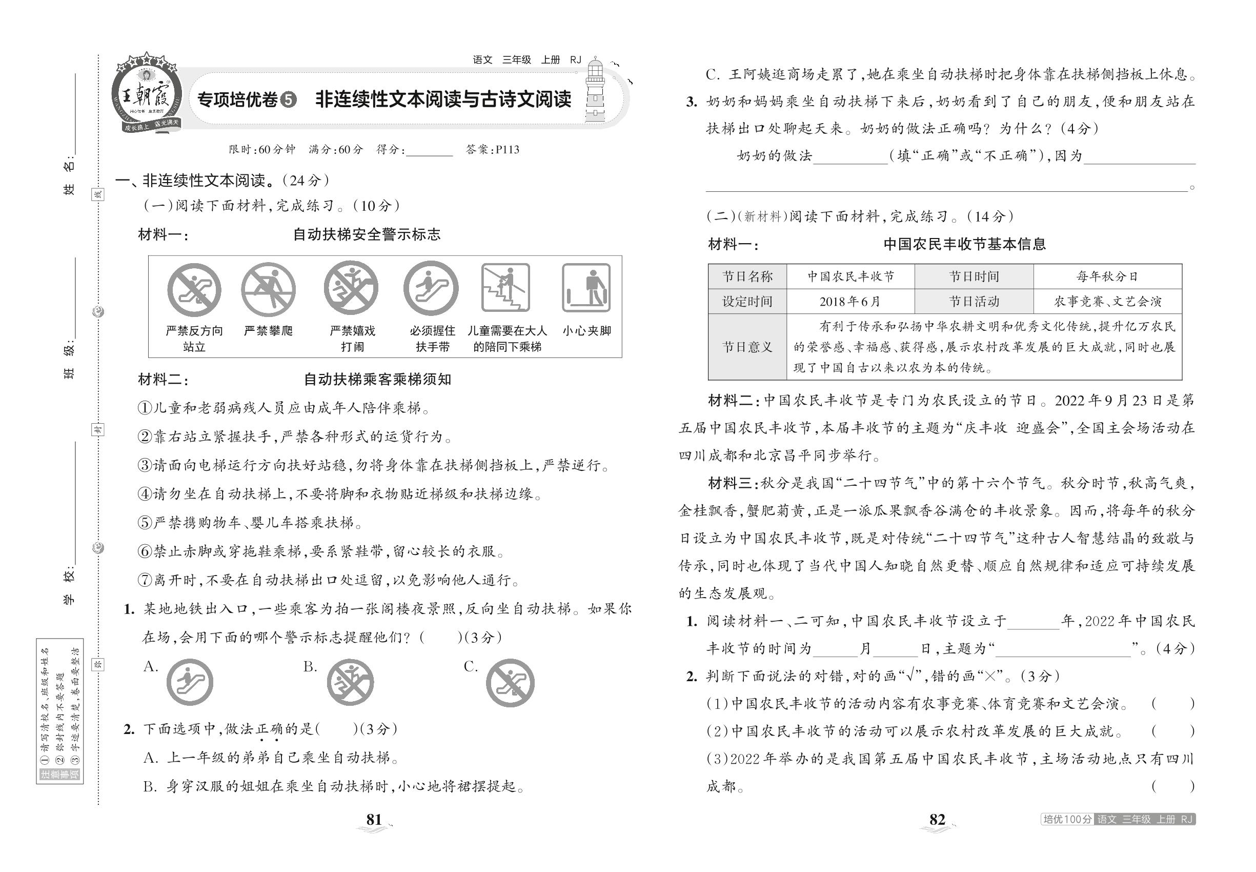2023上册三年级语文人教版 专项培优卷5 非连续性文本阅读与古诗文阅读