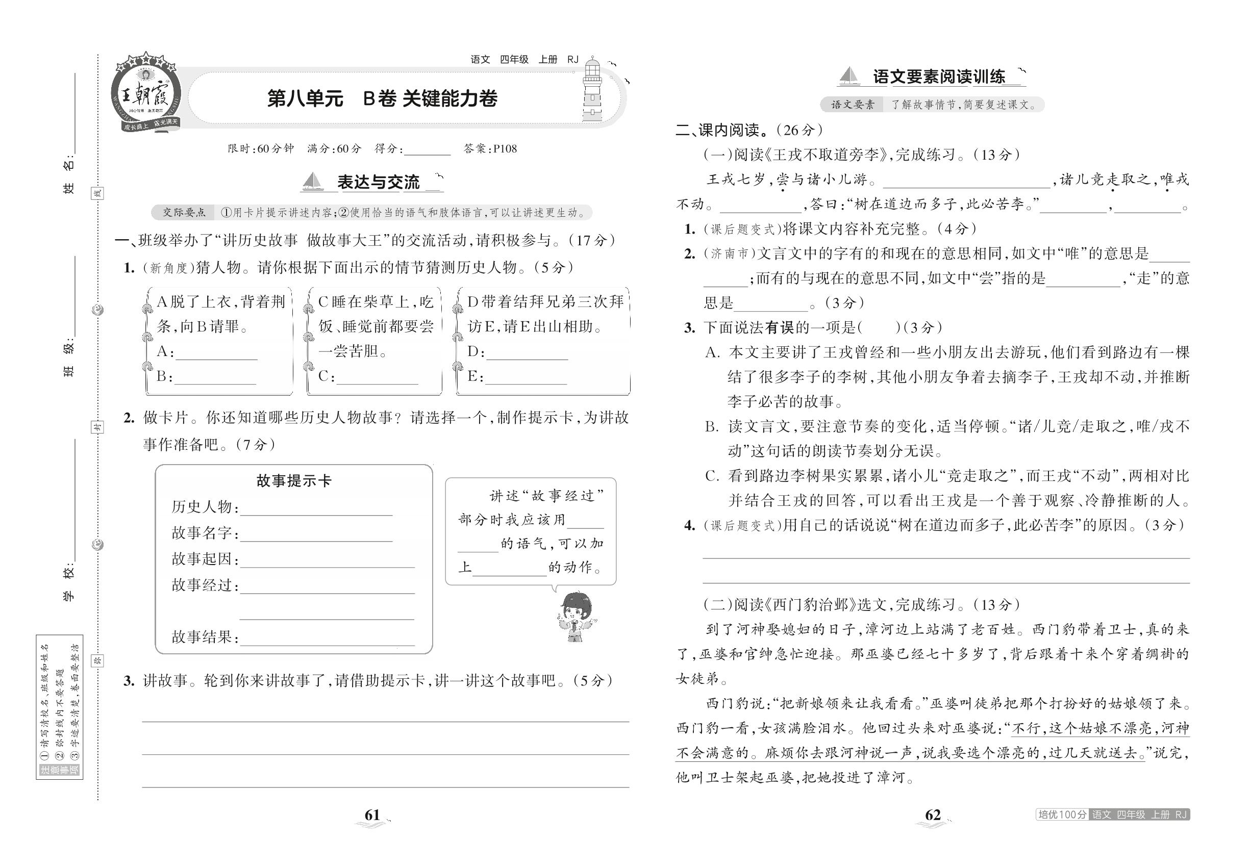 2023上册四年级语文人教版 第八单元B卷 关键能力卷