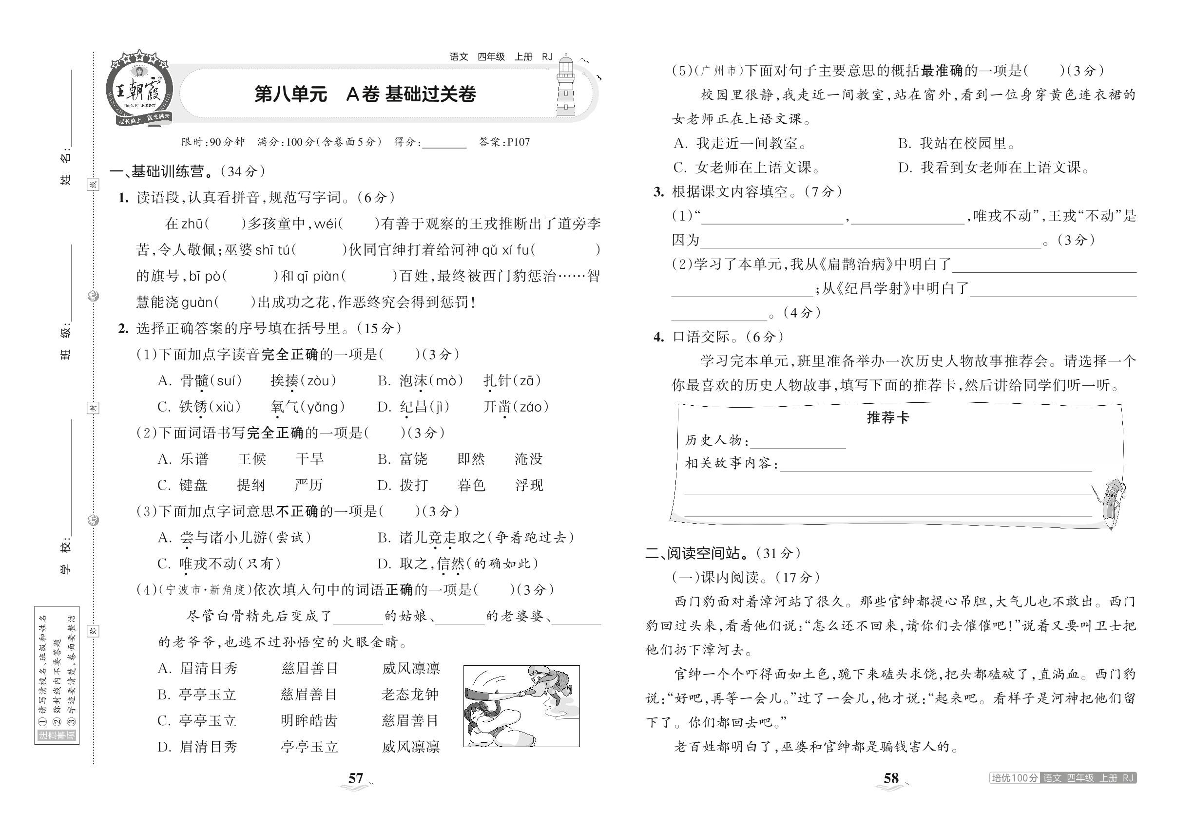 2023上册四年级语文人教版 第八单元A卷 基础过关卷