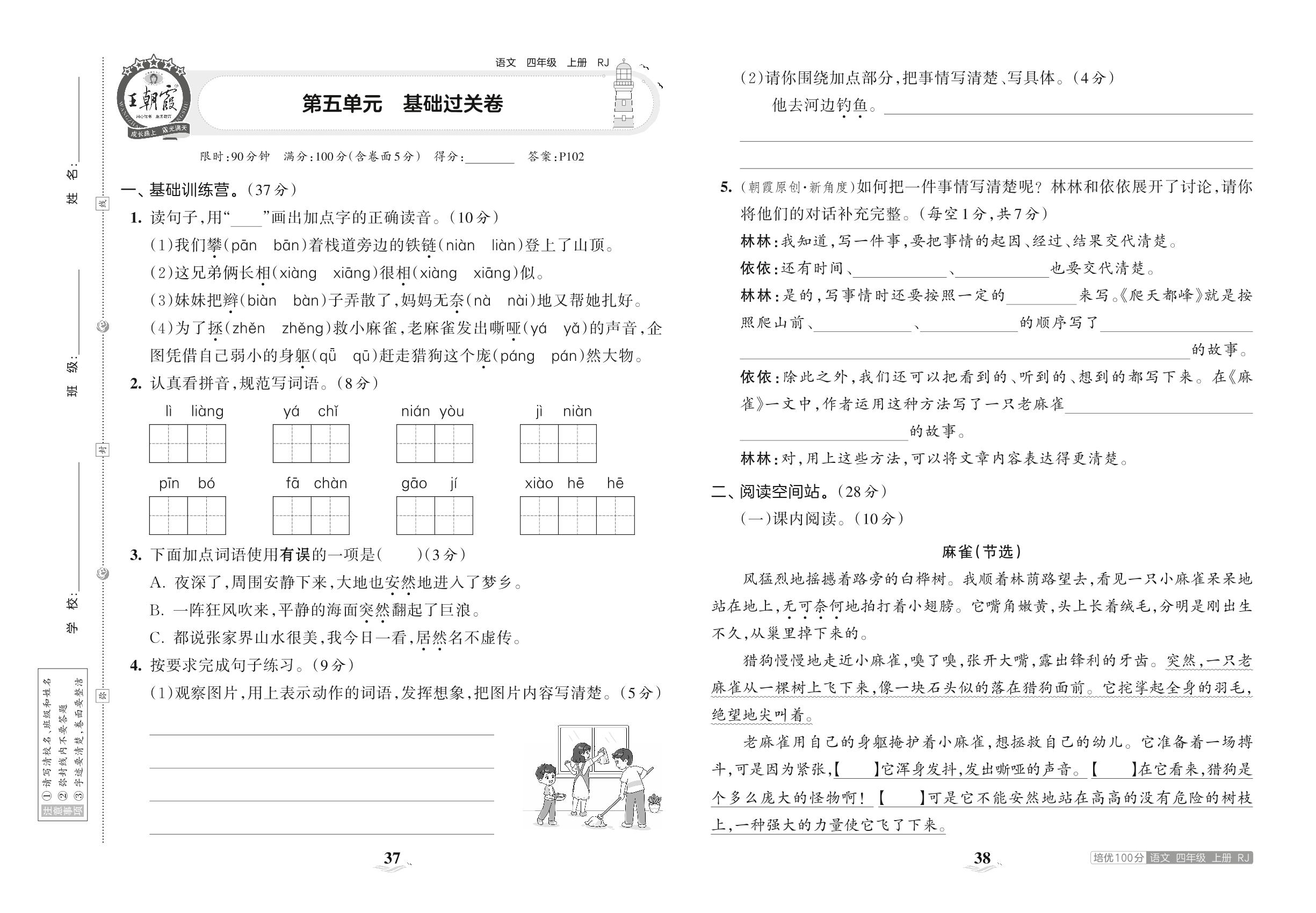 2023上册四年级语文人教版 第五单元 基础过关卷