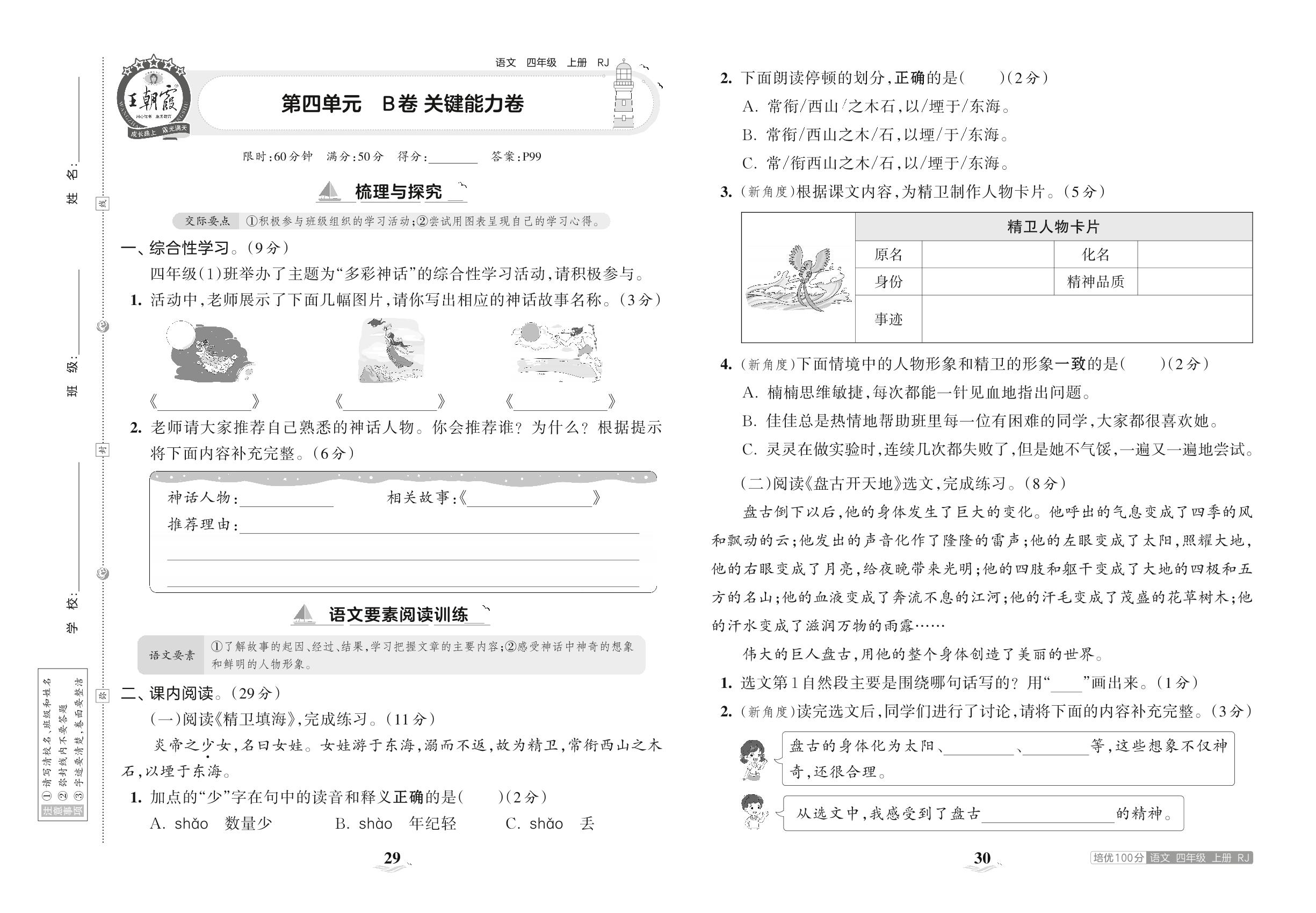 2023上册四年级语文人教版 第四单元B卷 关键能力卷