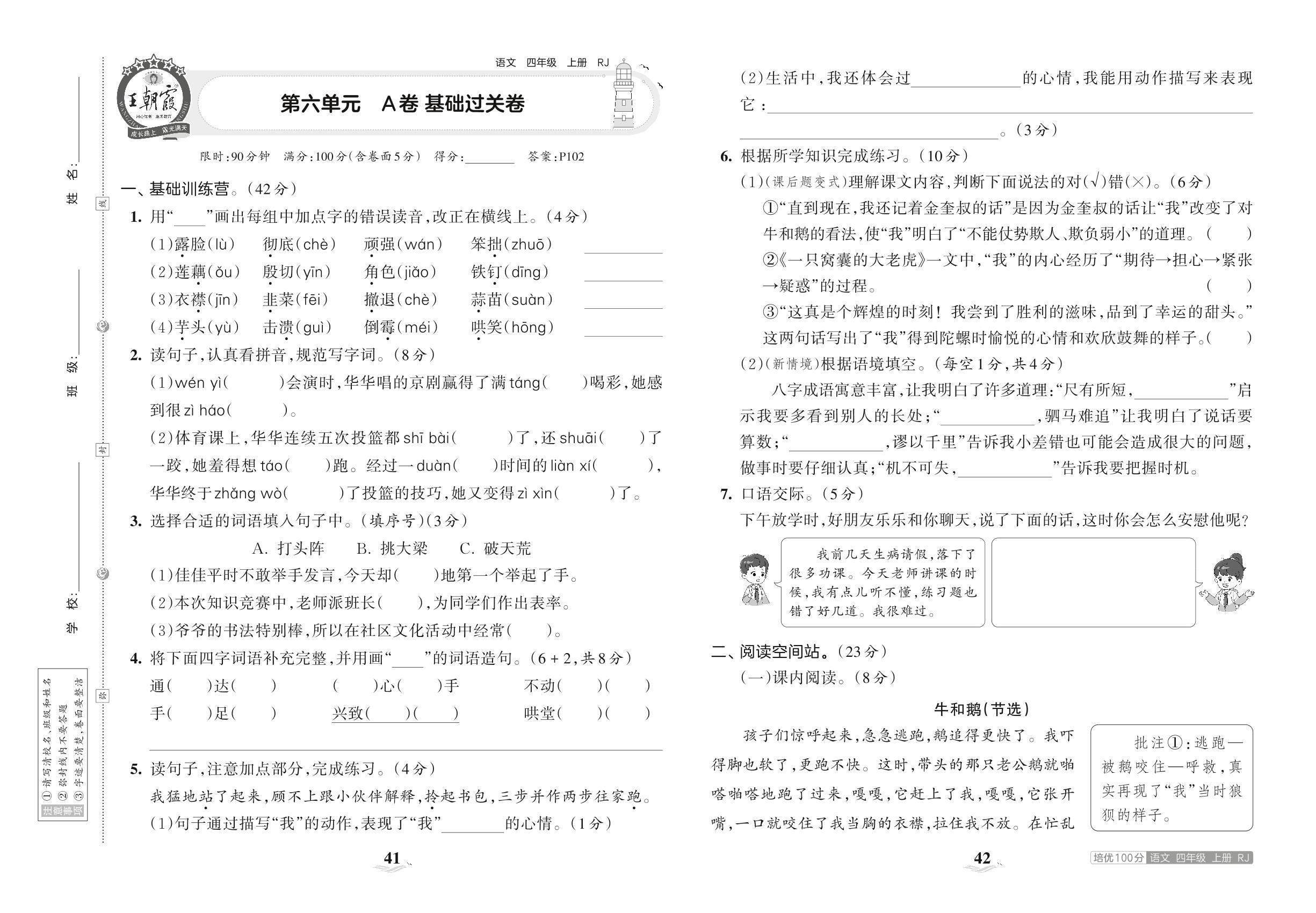 2023上册四年级语文人教版 第六单元A卷 基础过关卷