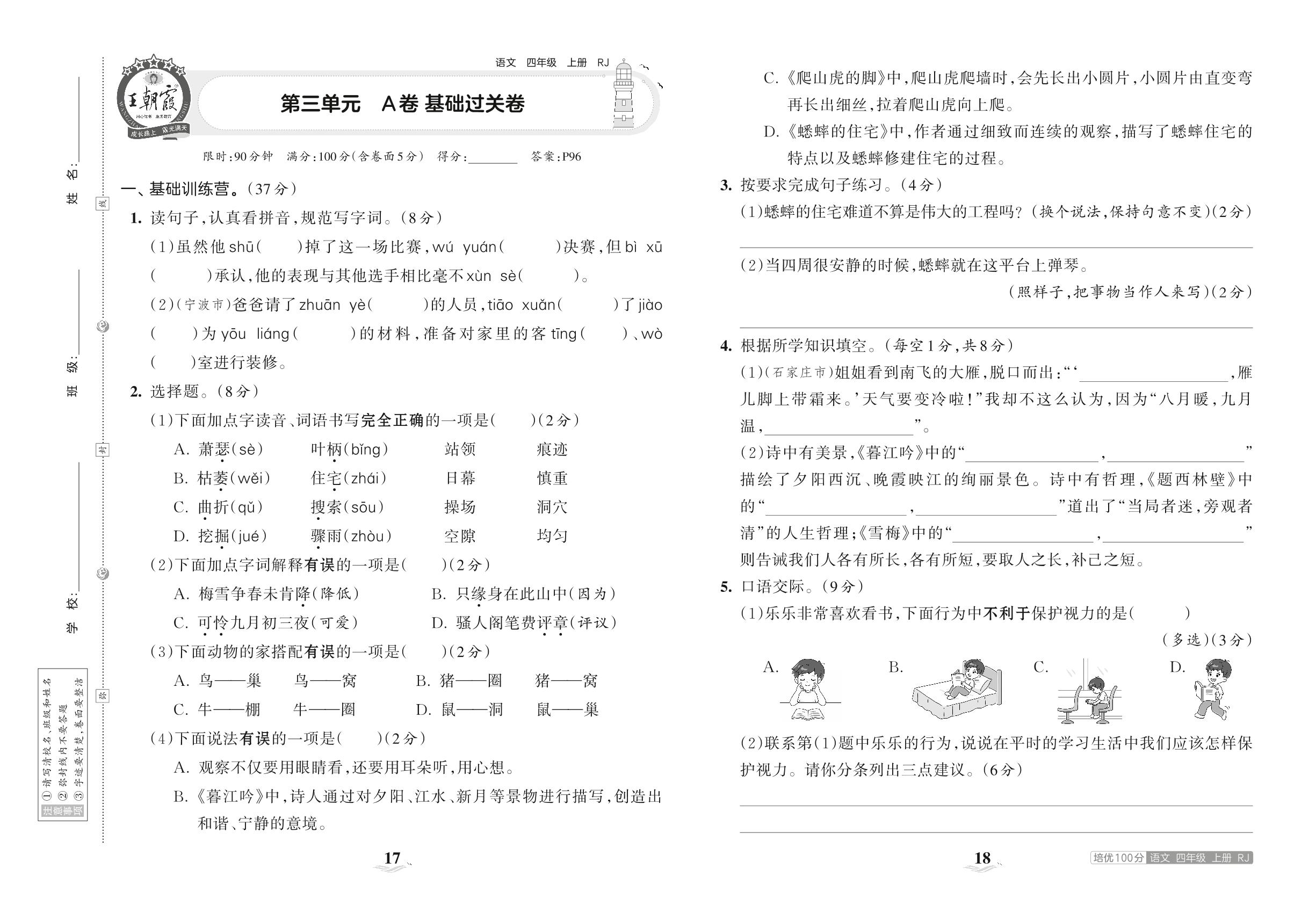 2023上册四年级语文人教版 第三单元A卷 基础过关卷
