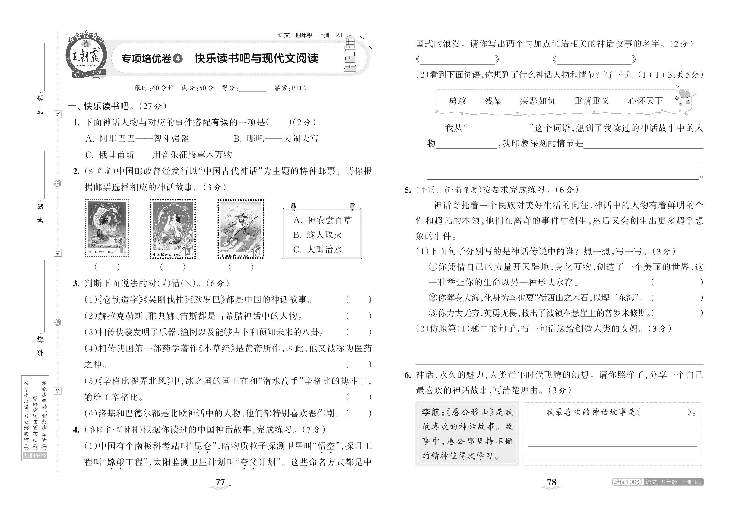 2023上册四年级语文人教版 专项培优卷4 快乐读书吧与现代文阅读