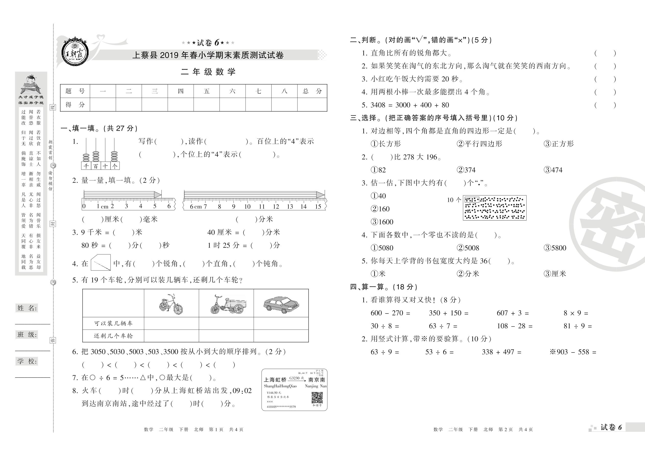 2018-2019学年第二学期驻马店市上蔡县二年级数学试卷(北师版)【6】