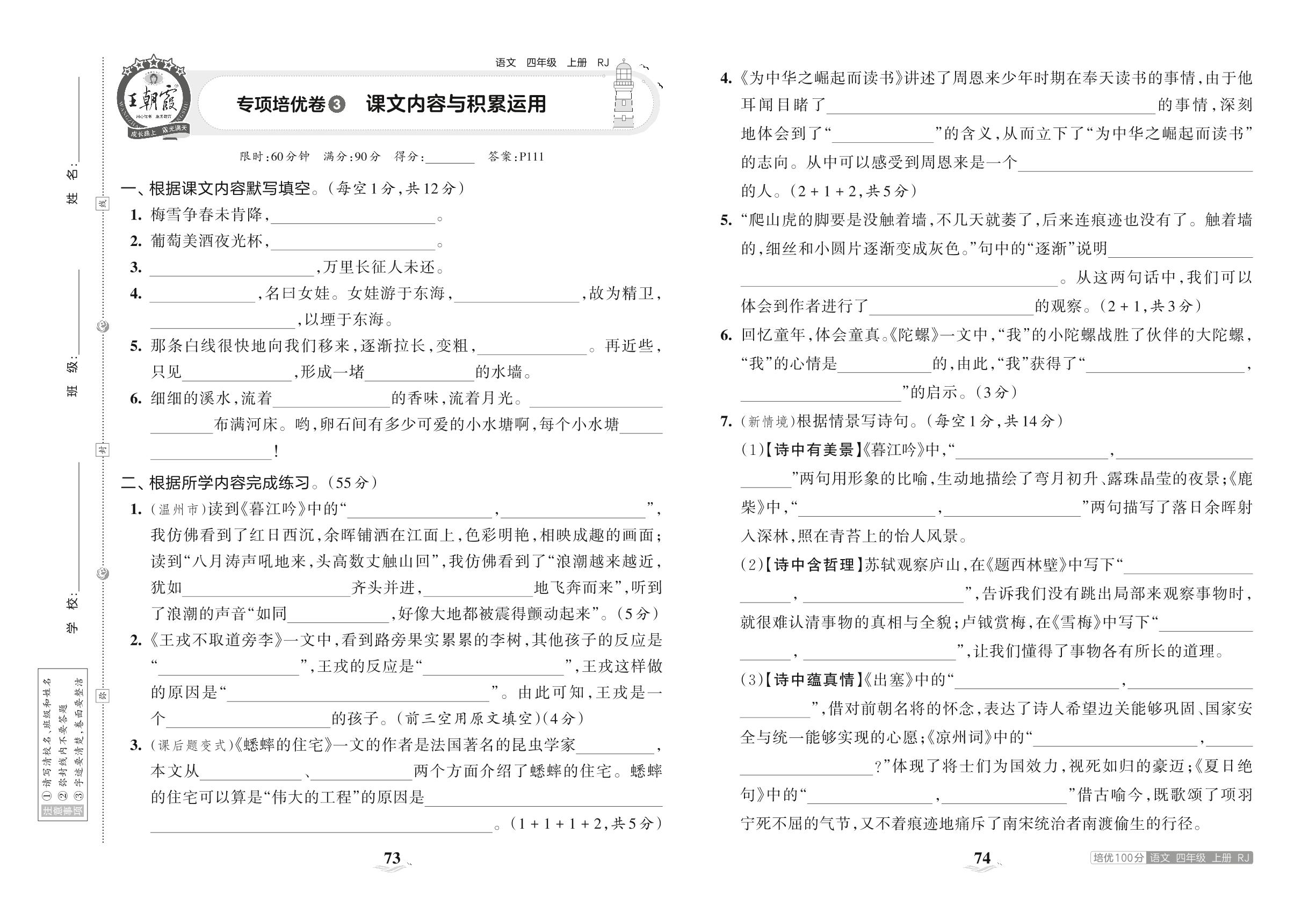 2023上册四年级语文人教版 专项培优卷3 课文内容与积累运用