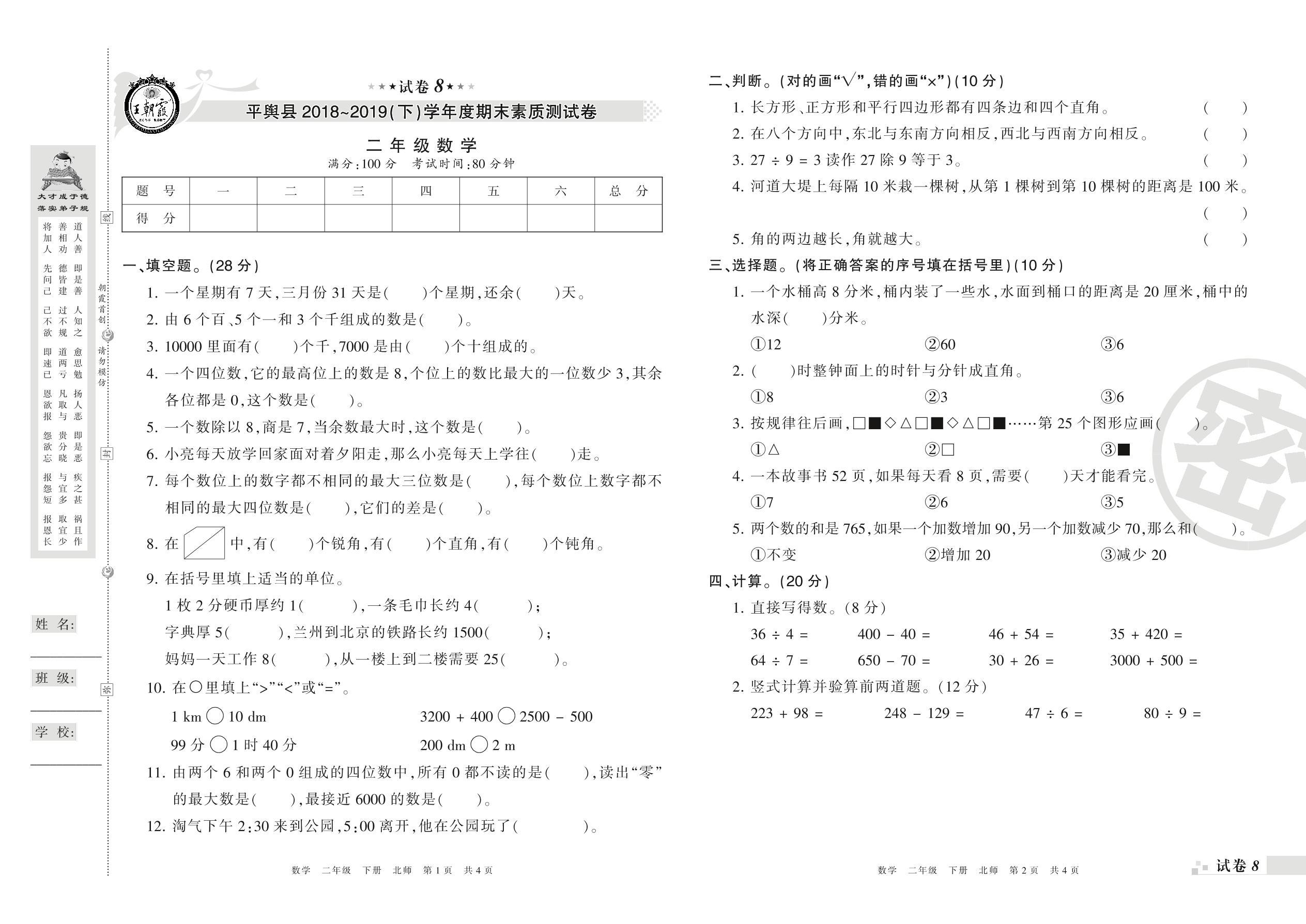 2018-2019学年第二学期驻马店市平舆县二年级数学试卷(北师版)【8】