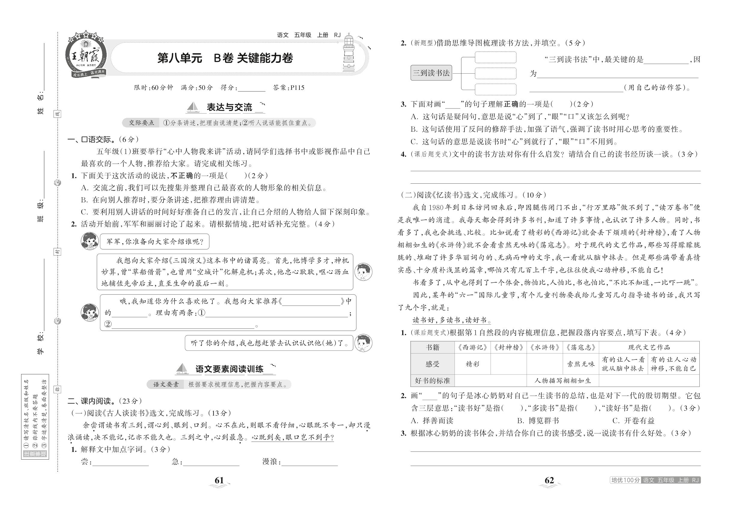 2023上册五年级语文人教版 第八单元 B卷 关键能力卷