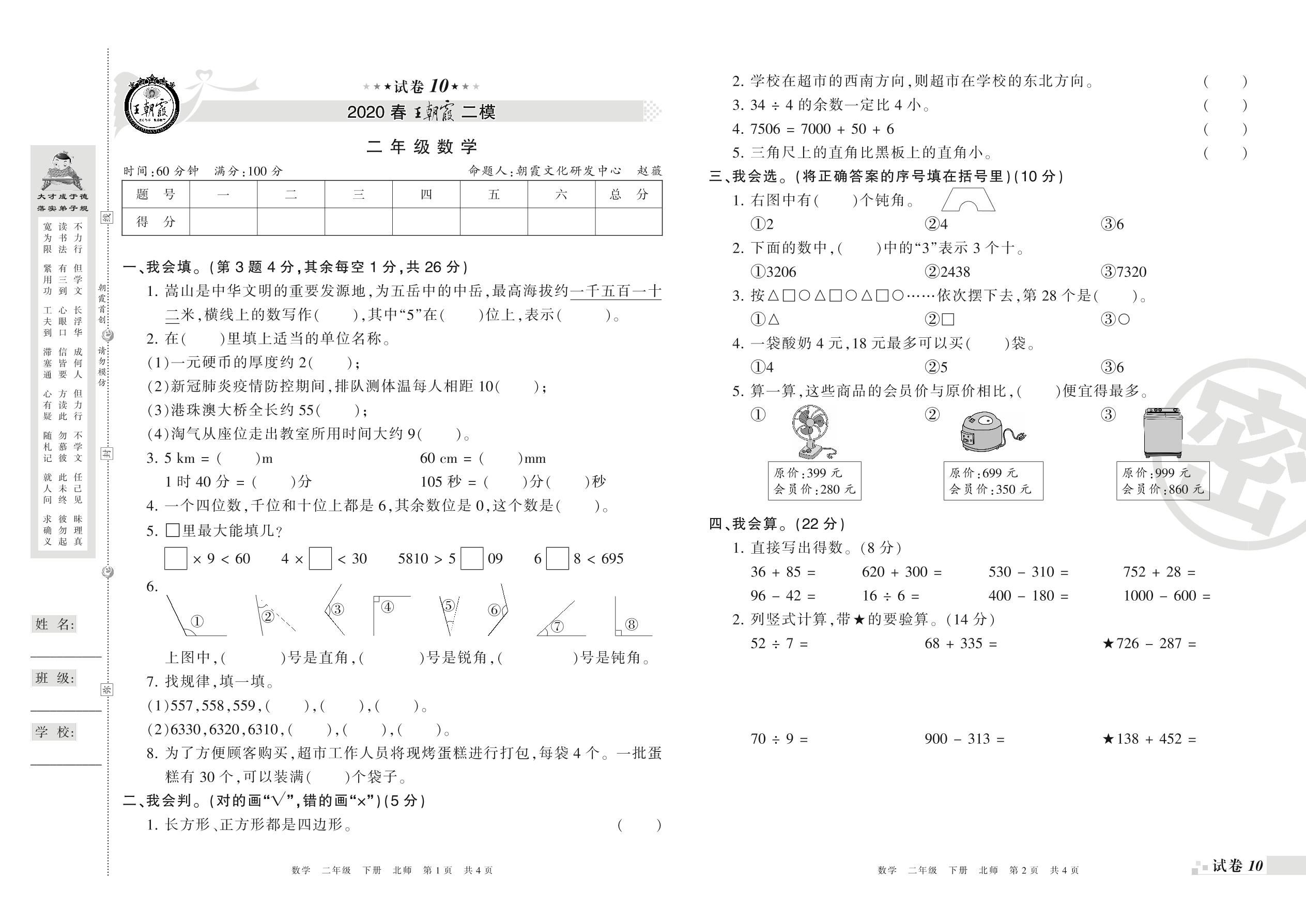 王朝霞期末模拟卷二年级下册数学(北师版)_R21080392233【10】