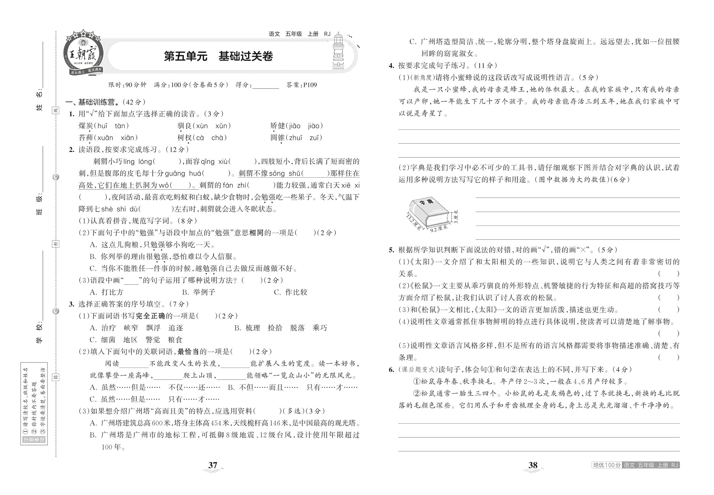 2023上册五年级语文人教版 第五单元 基础过关卷
