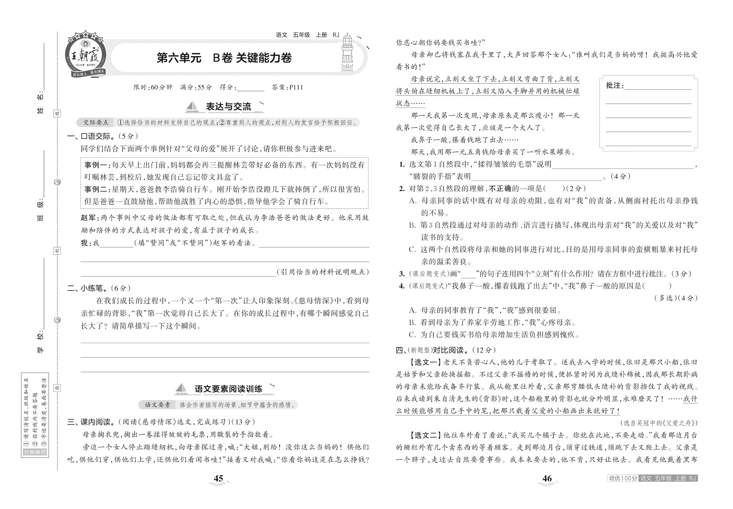 2023上册五年级语文人教版 第六单元 B卷 关键能力卷