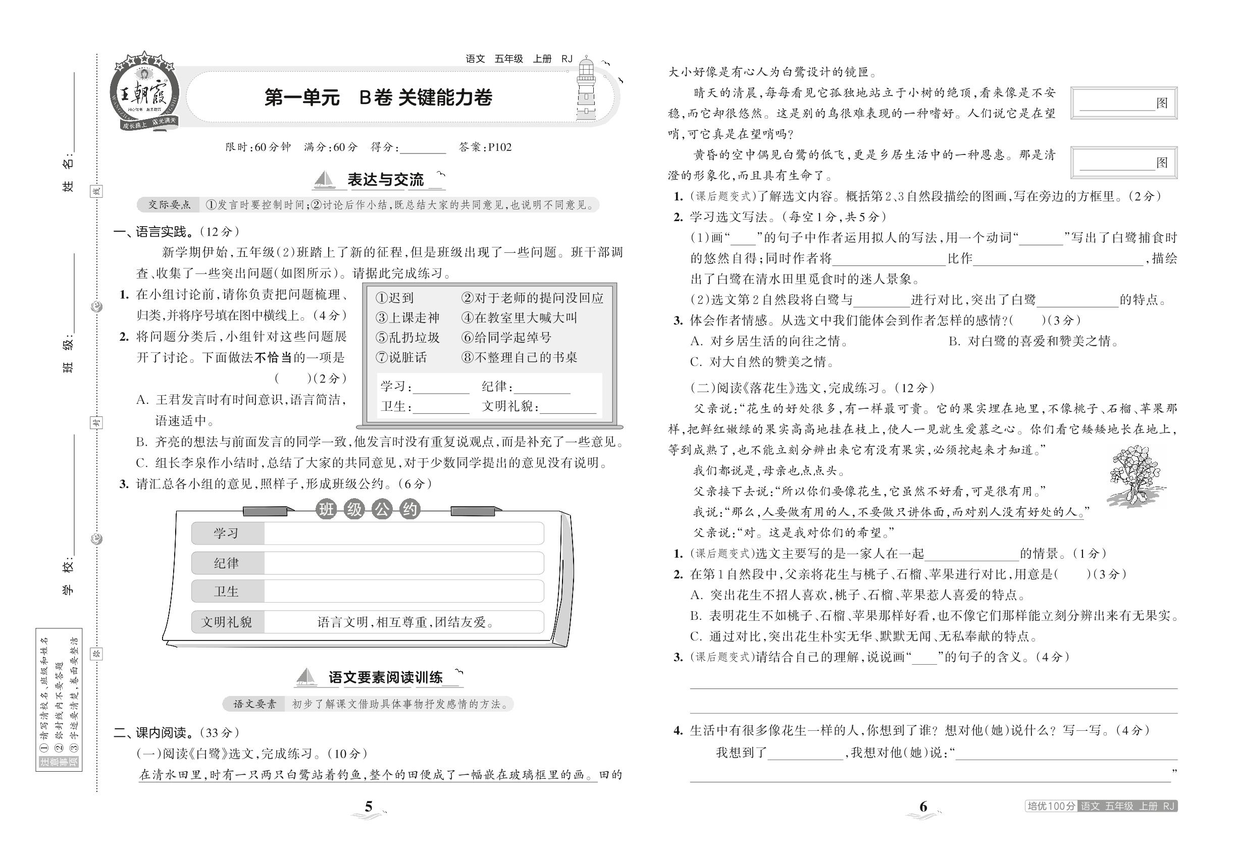 2023上册五年级语文人教版 第一单元 B卷 关键能力卷