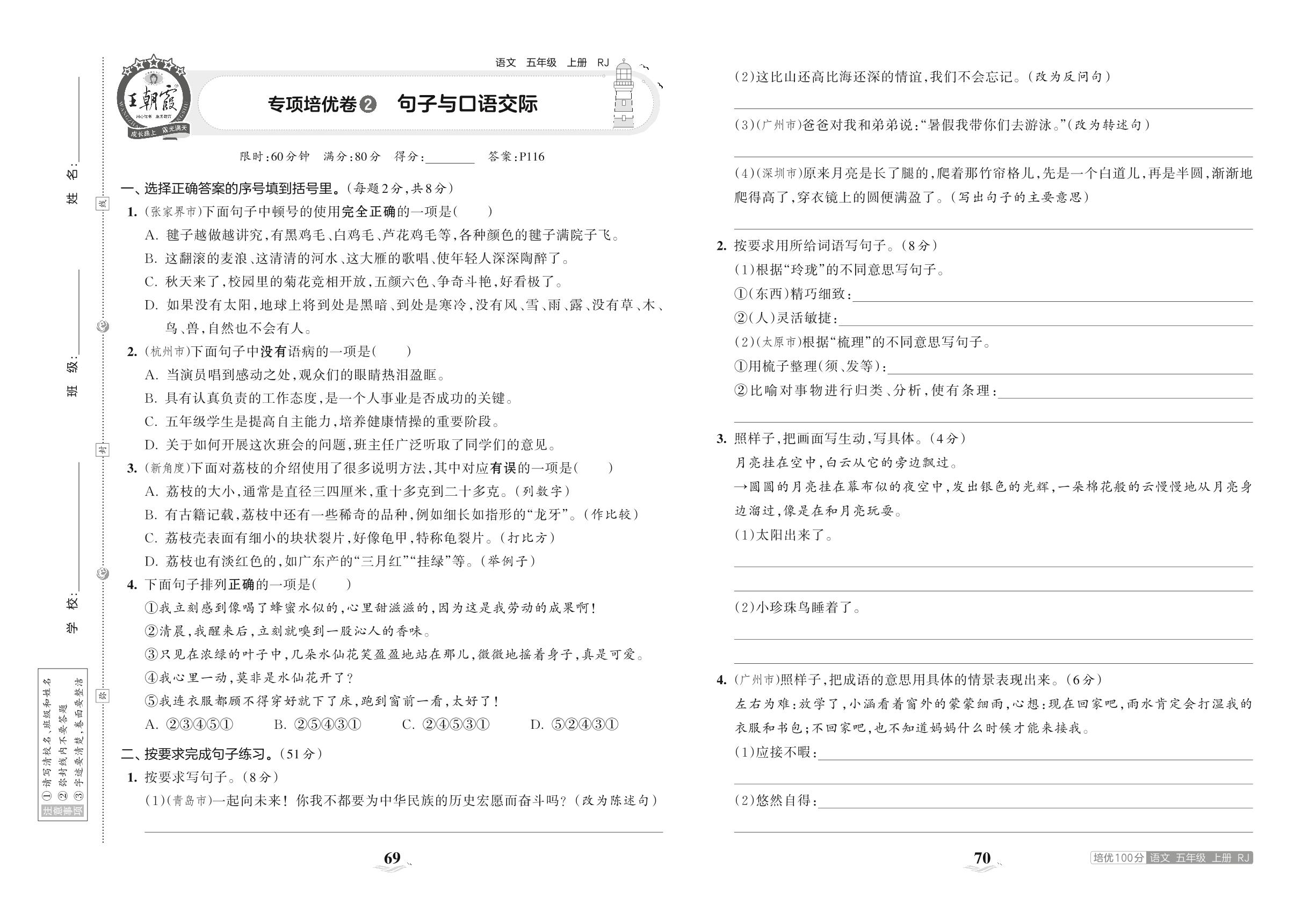 2023上册五年级语文人教版 专项培优卷2 句子与口语交际