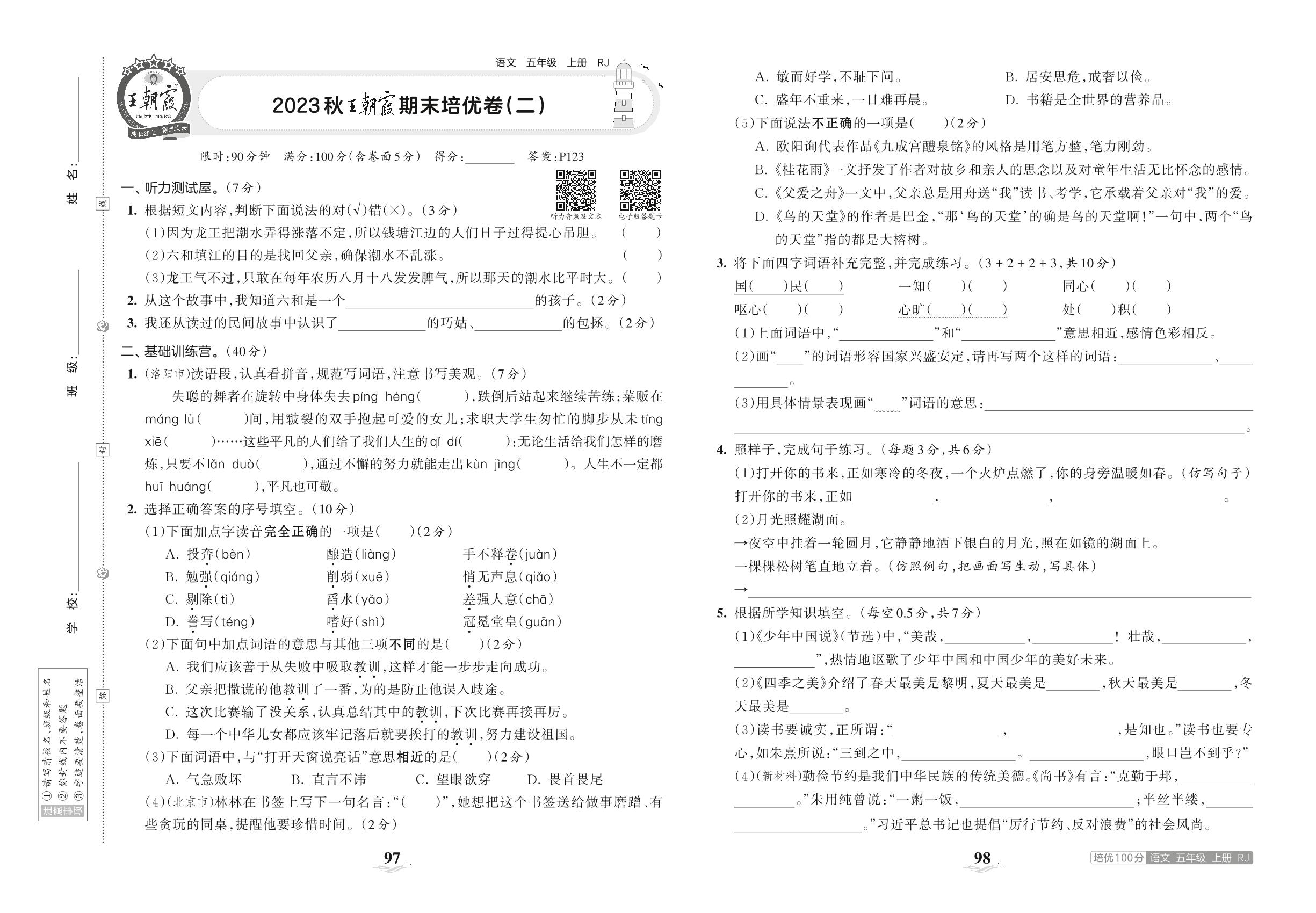 2023上册五年级语文人教版 2023秋王朝霞期末培优卷(二)