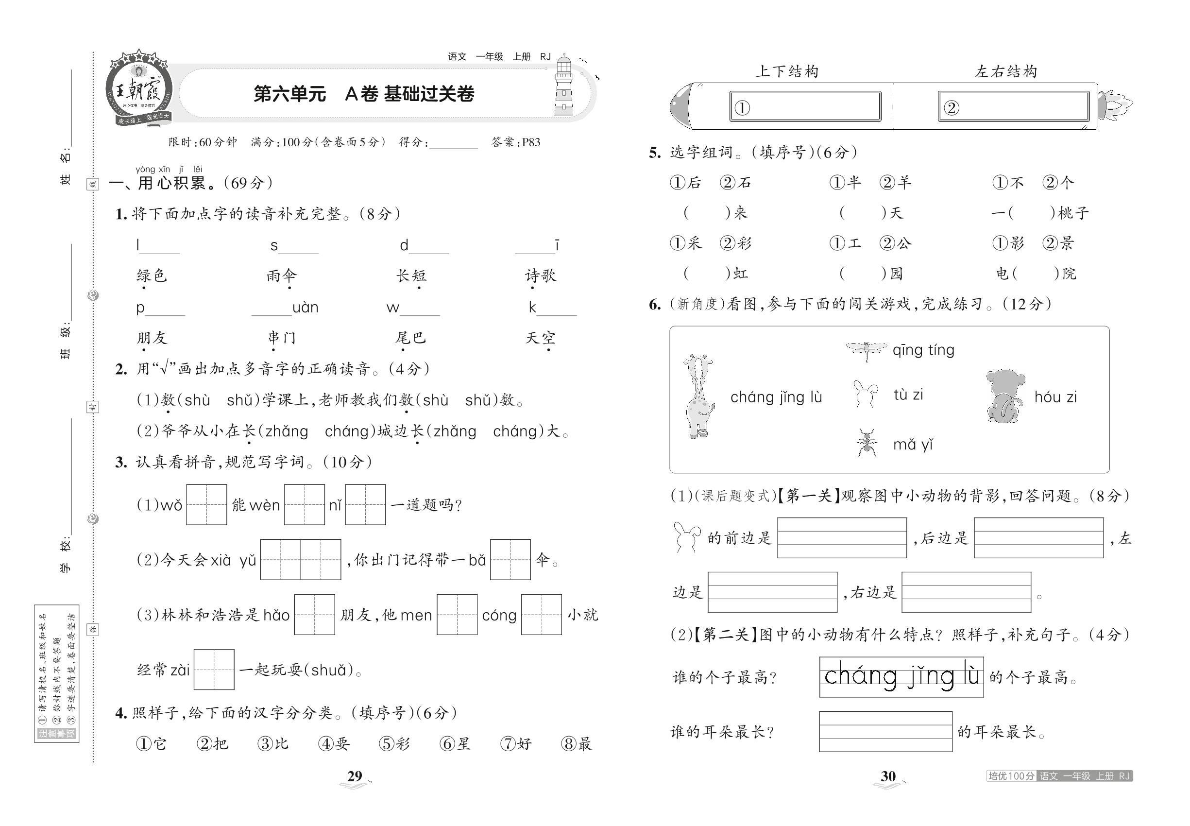 2023上册一年级语文人教版 第六单元 A卷 基础过关卷