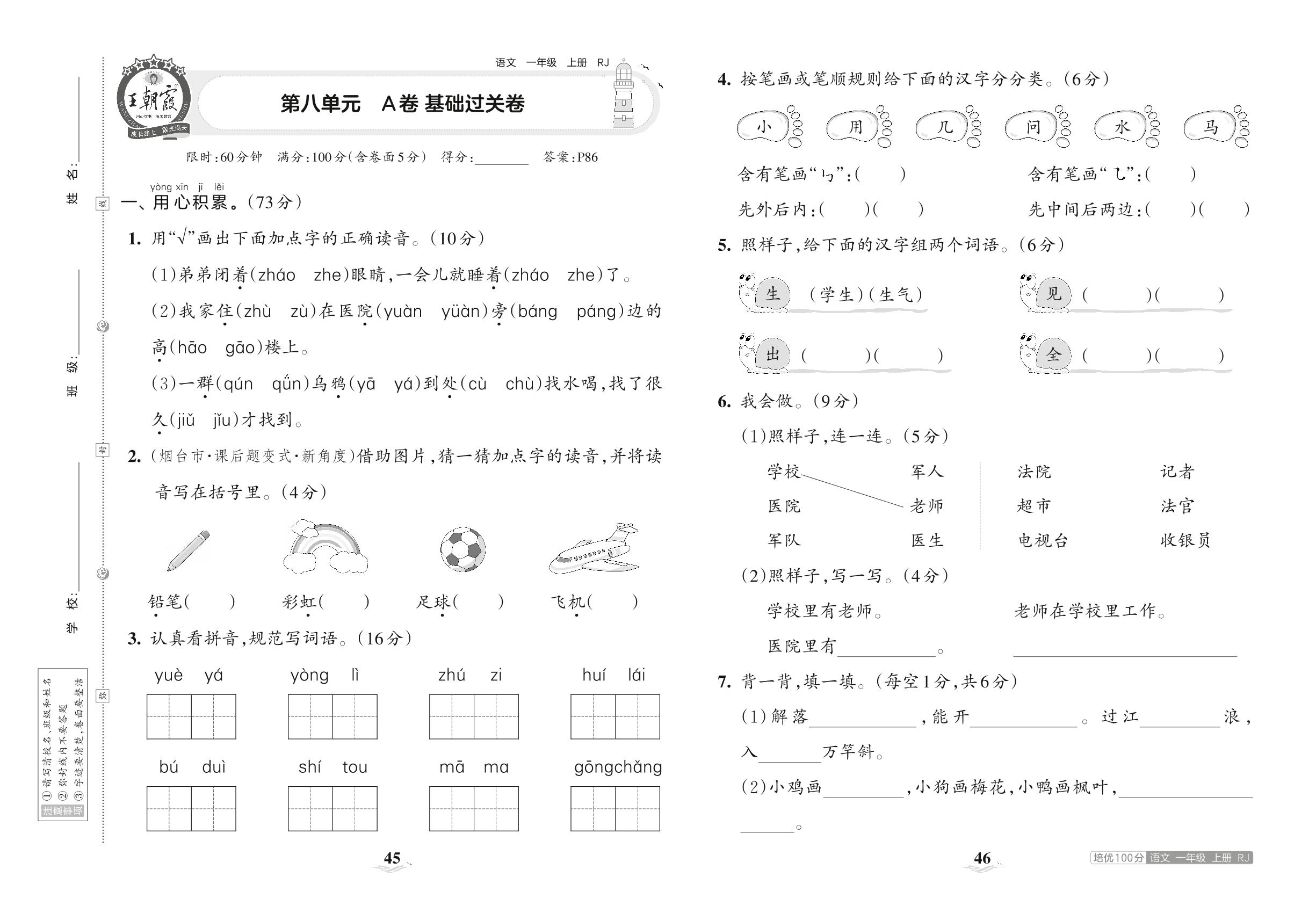 2023上册一年级语文人教版 第八单元 A卷 基础过关卷