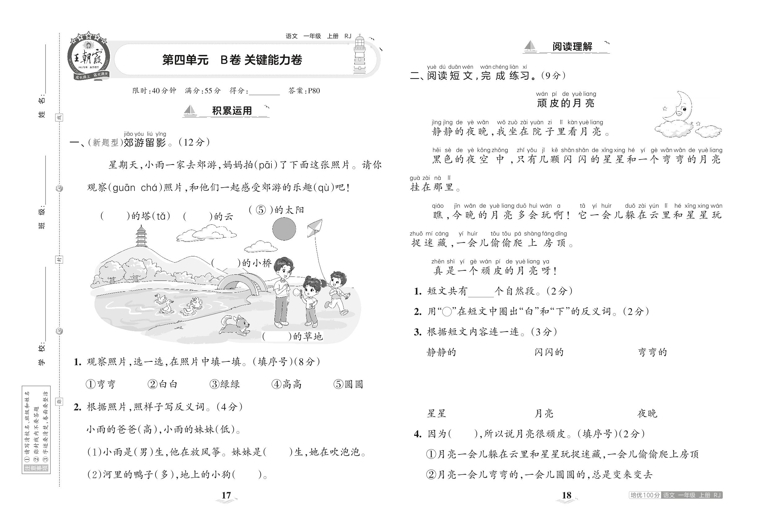 2023上册一年级语文人教版 第四单元 B卷 关键能力卷